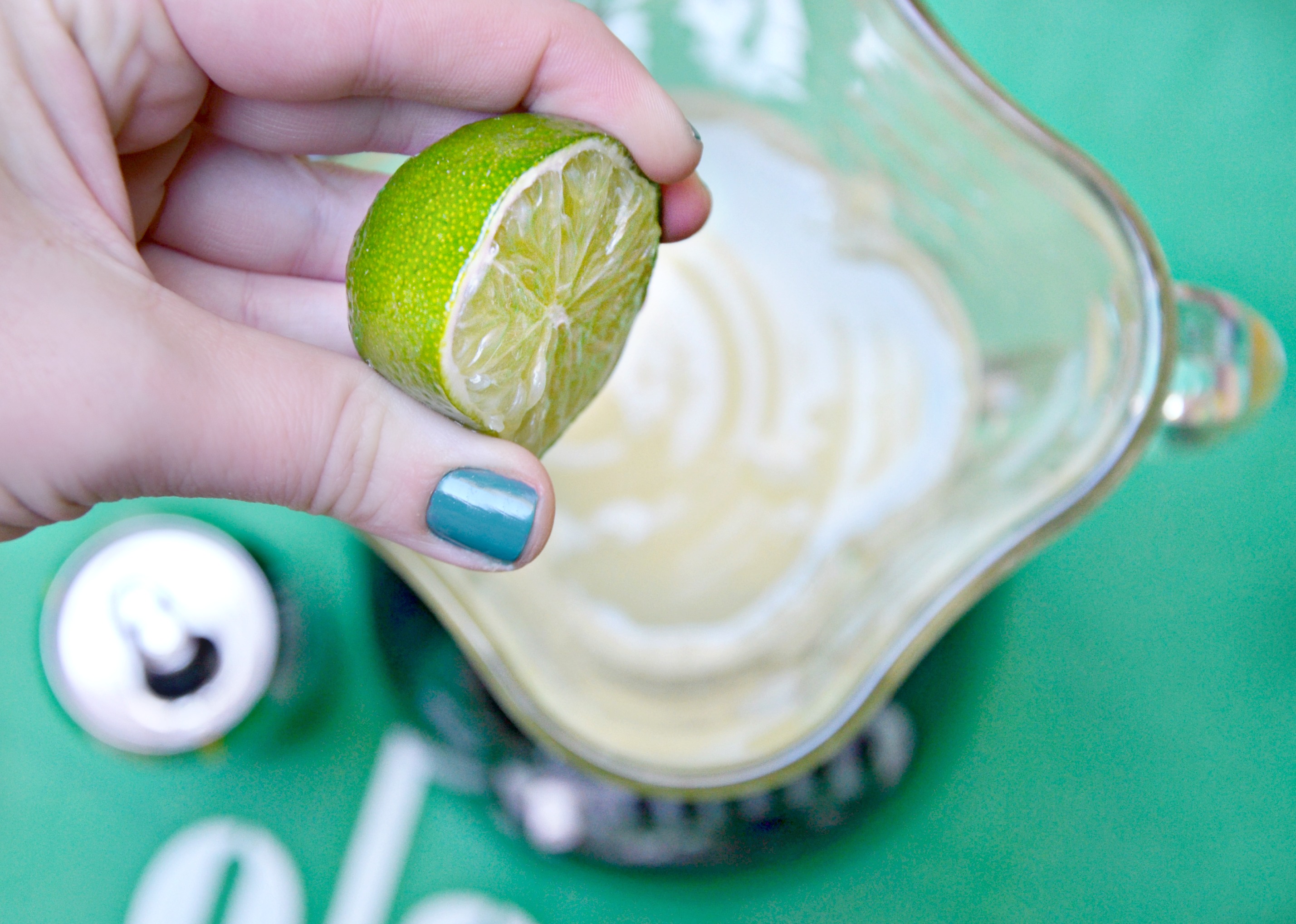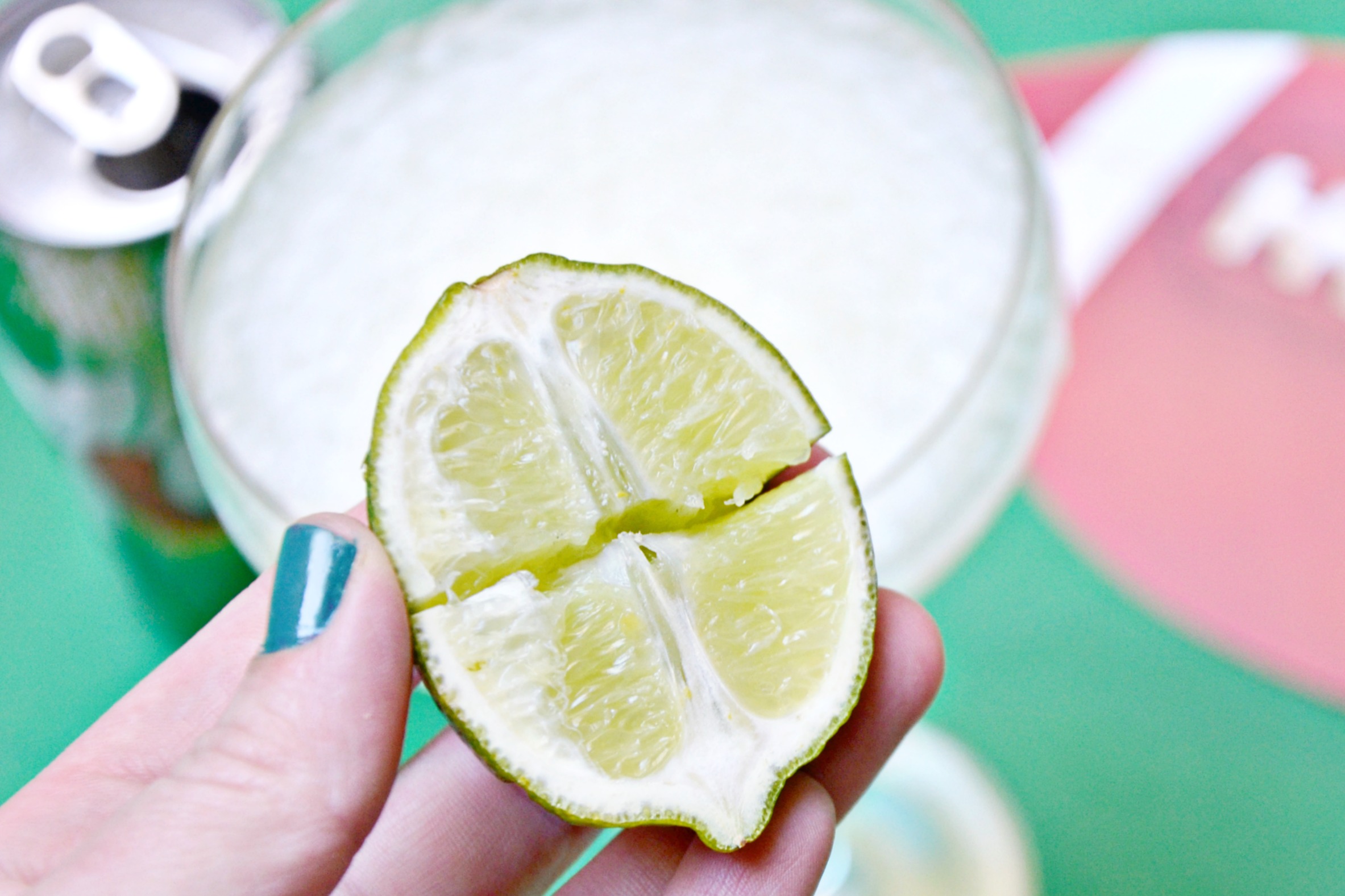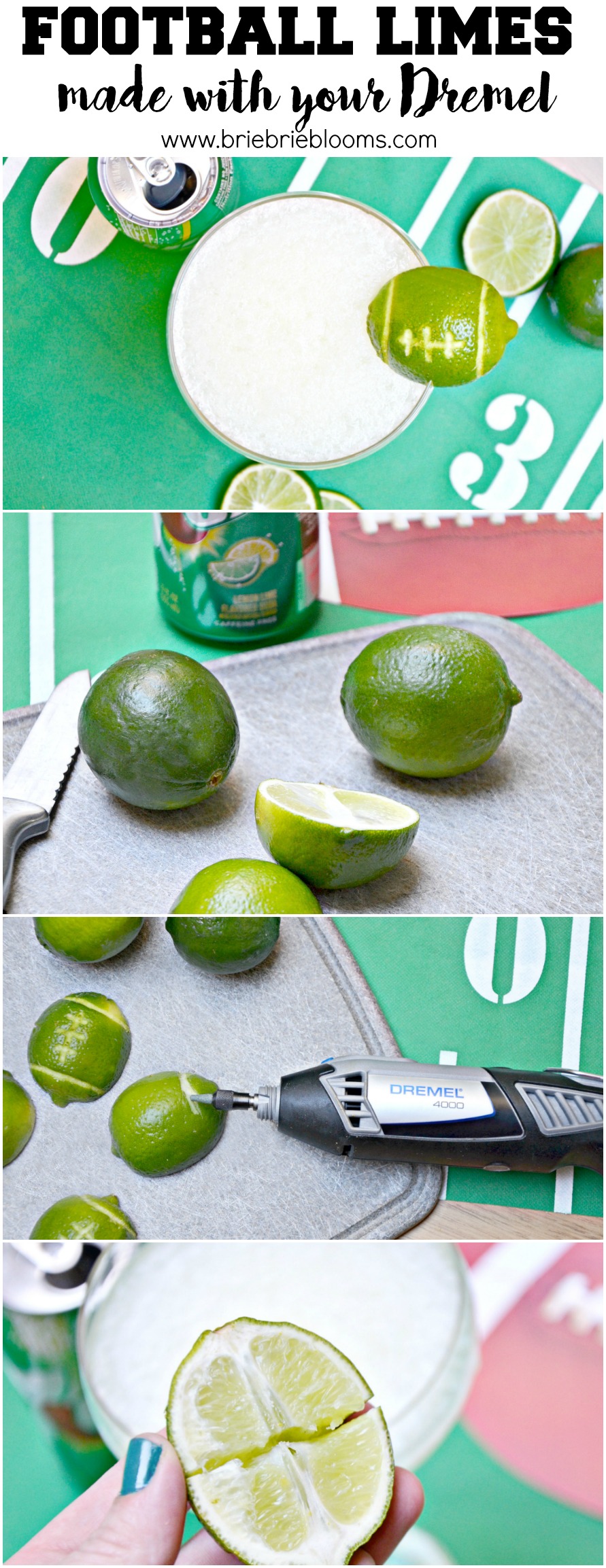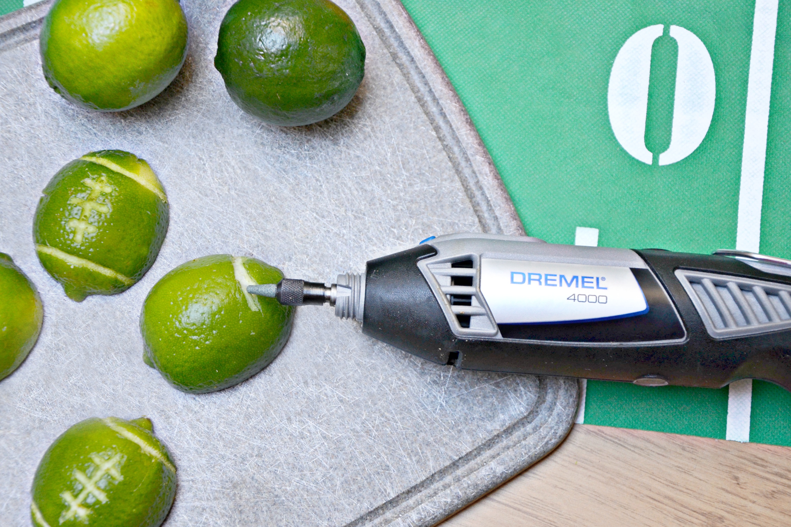 The football limes are a quick garnish to make and definitely add some fun to your 7UP Game Day Rita. Simply cut limes in half then use a Dremel tool to gently draw the football lines. This can easily be done with kitchen tools if you would prefer but the Dremel is the most quick way to get the lines straight. I’m a busy mom with so much on my agenda when getting ready for parties – make those cute football limes fast!