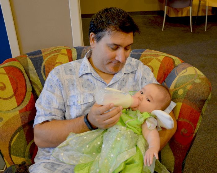 All babies are different, but for my four month old daughter, food usually solves all her problems. Be prepared to take a few short breaks for a bottle to soothe a fussy baby.