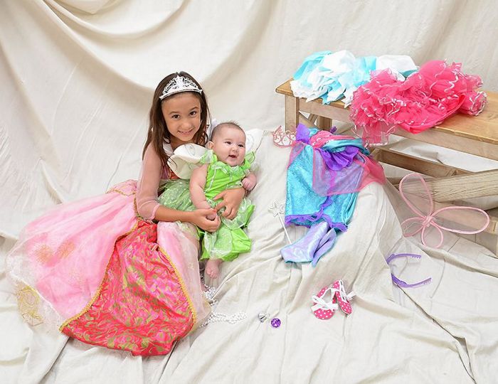 Favorite toys, blankies, and other items are encouraged. My six year old daughter asks everyday if she can dress up her baby sister. At home dressing up the baby is not an activity mom usually approves of, but during our Portrait Innovations studio session, my daughter was so excited to take photos with her in dress up clothes! We brought a few different costumes, accessories, crowns, and wands for this adorable photo.