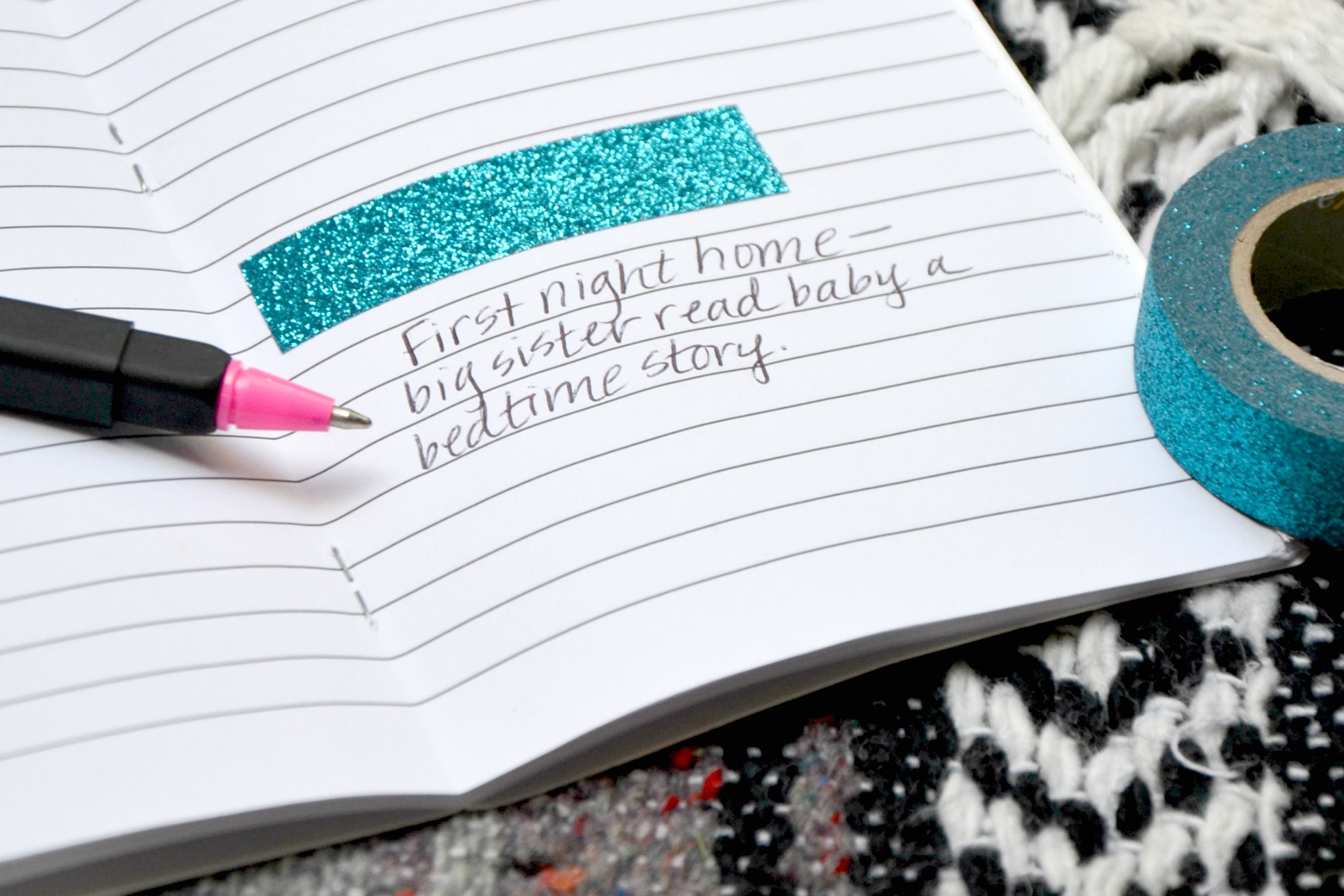 Already having a child, I knew how quickly this perfect time with a newborn at home would pass and unless I wrote everything down, I likely wouldn’t remember those favorite moments. A journal, pen and sparkly washi tape helped me jot down memories as they were being made. It’s nothing fancy and sometimes big sister picked up a pen and added to the journal too. This sweet book of memories will be forever cherished.