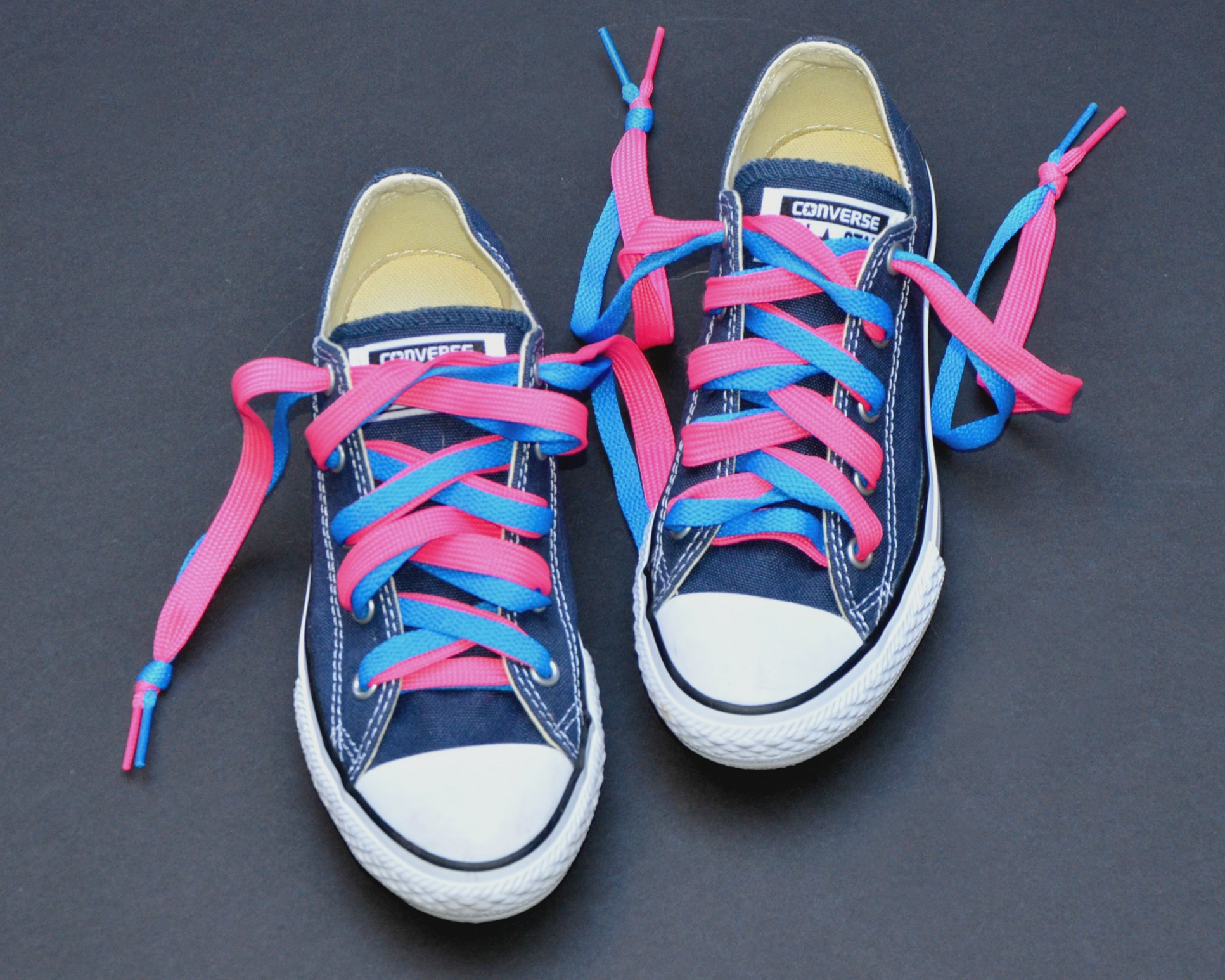 My daughter decided she wanted dark blue shoes personalized with two brightly colored shoelaces.