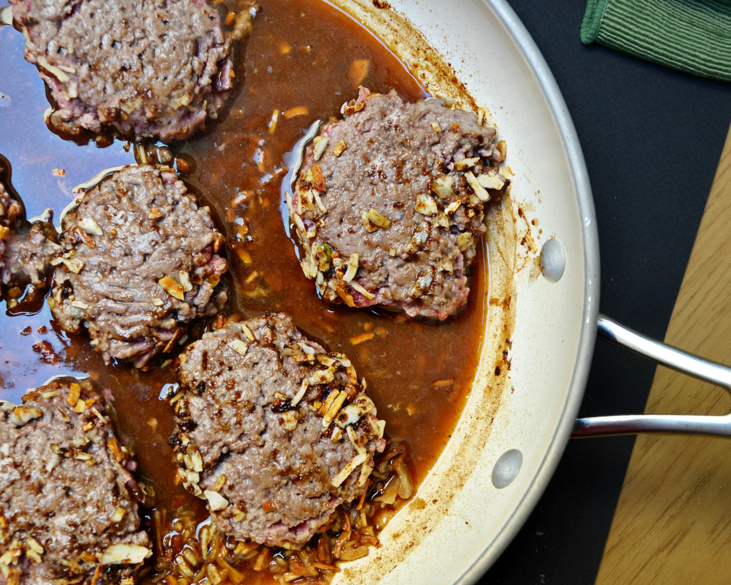 Brown each side of the patties then add 1/2 C water. Cover and simmer until meat has reached your preferred temperature. Sauce will thicken as it cooks.