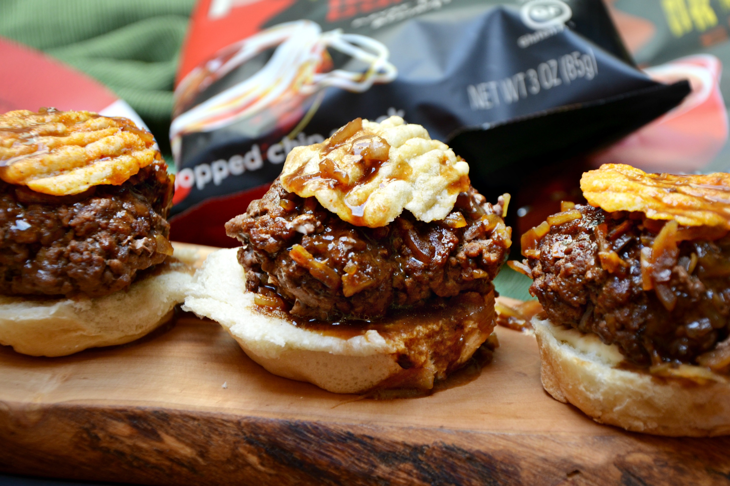 It’s almost time for the Big Game! We’ll be celebrating with drinks, food and football. I really like finger foods for hosting parties but when we’re talking football, a good burger is a must. The best Big Game sliders recipe satisfies both needs – finger foods and burgers! Topped with crunchy PopChips Ridges and smothered in french onion sauce, this is the ultimate Big Game party food. The baked chips have half the fat of fried chips and give your tastebuds a delicious workout with an award winning lineup.