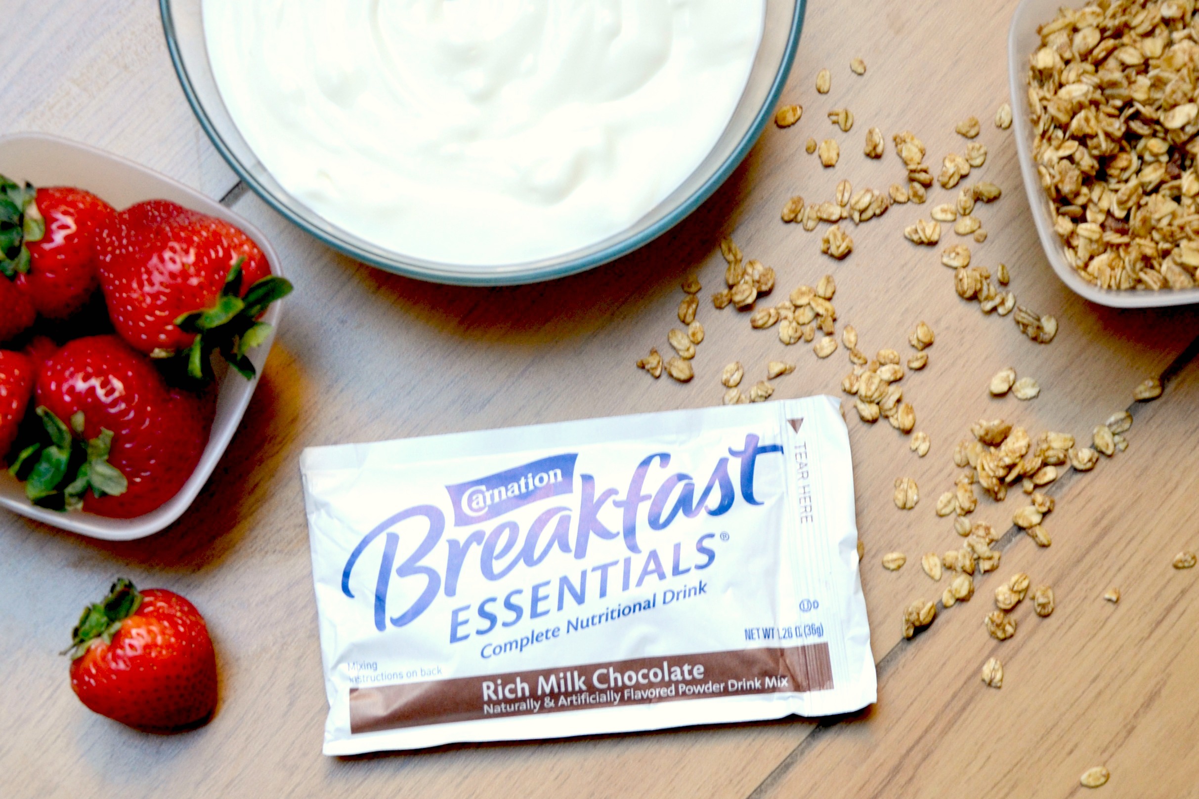 1) Mix one packet of chocolate Carnation Breakfast Essentials® with plain greek yogurt.