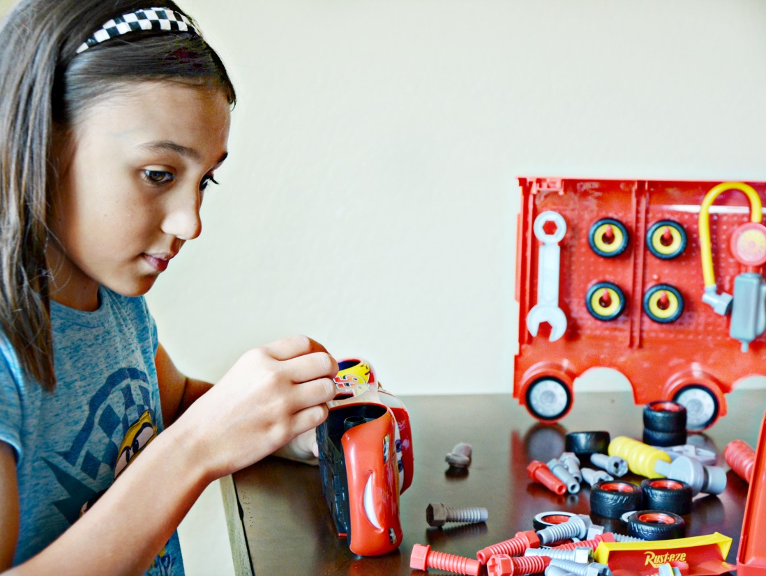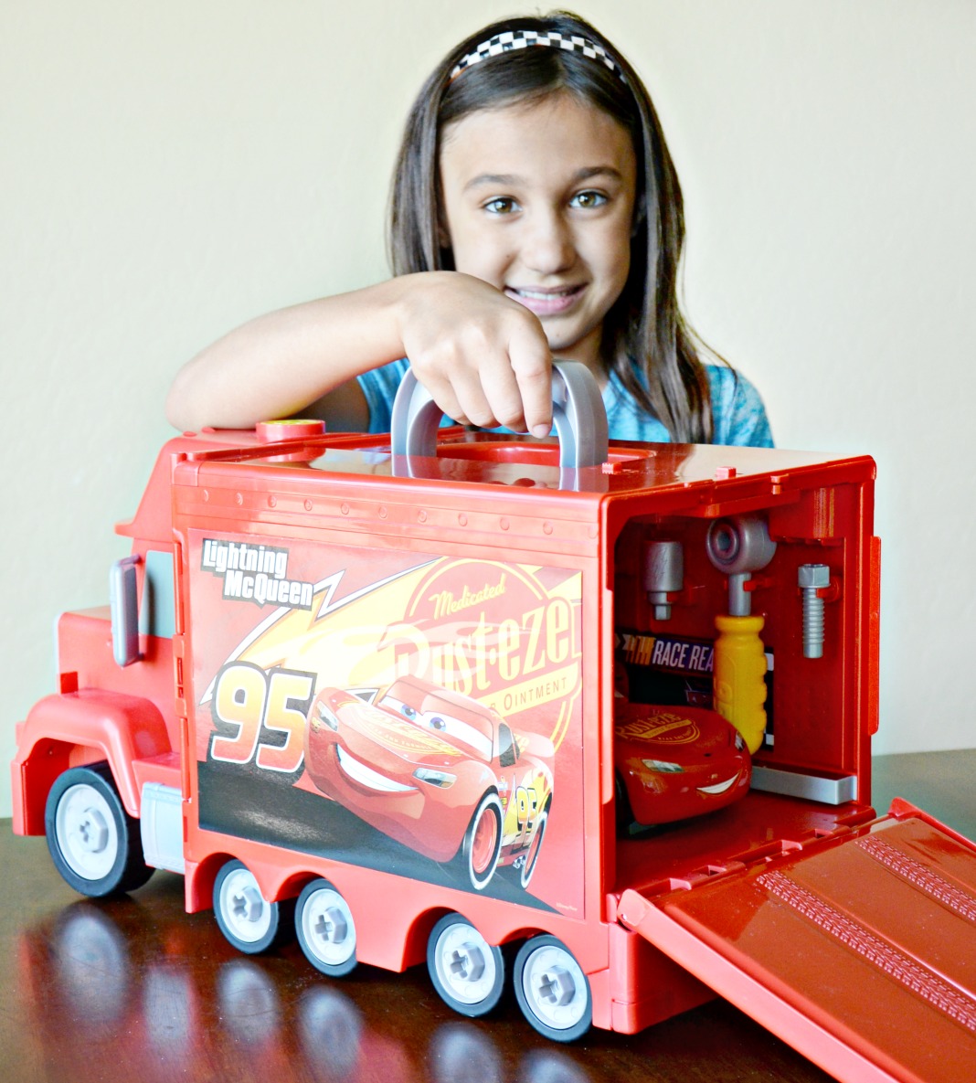 Wearing her favorite Cruz Ramirez shirt and Cars headband, my daughter was very excited when the Amazon package full of Cars fun arrived on our doorstep. Before we opened the Cars 3 merchandise boxes, I knew my daughters would love the toys! Just Play Mack’s Mobile Tool Center is huge with a very real Mack that opens and a full set of tools to get Lightning McQueen race ready! Lightning McQueen is also included in the mobile tool center play set. Pressing the top of Mack makes fun race noises and the big diagnostic screen makes sure Lightning is race ready. With 24 pieces and so many different hands on activities including a real working lift, Mack’s Mobile Tool Center is a great purchase for the ultimate Cars fan!