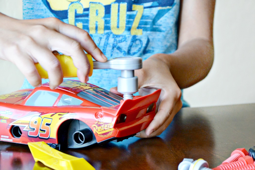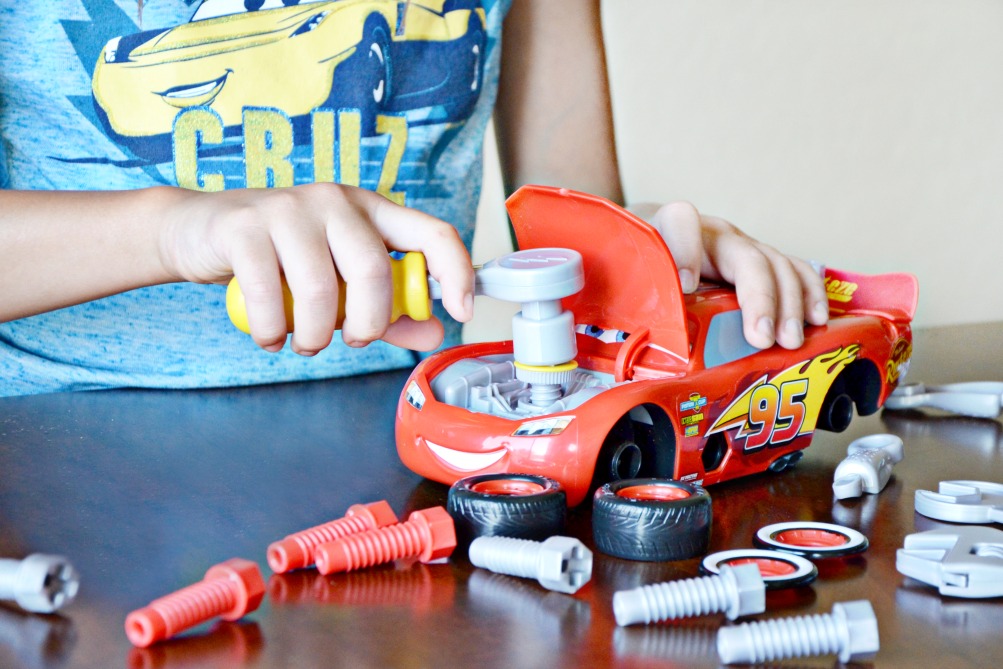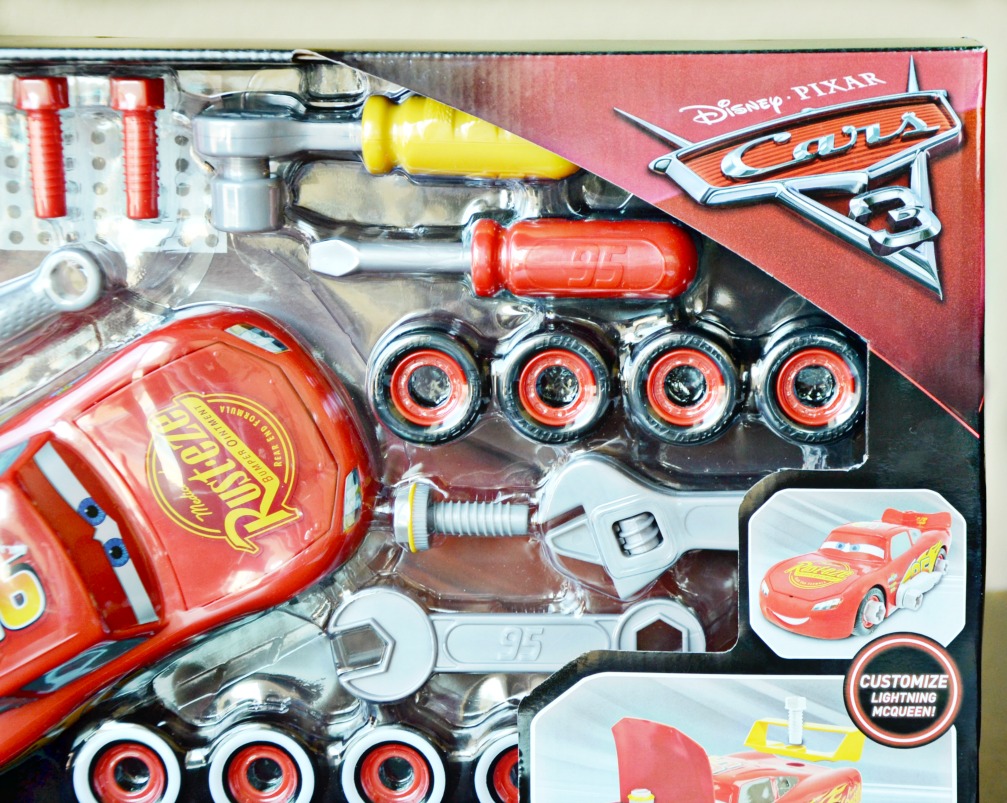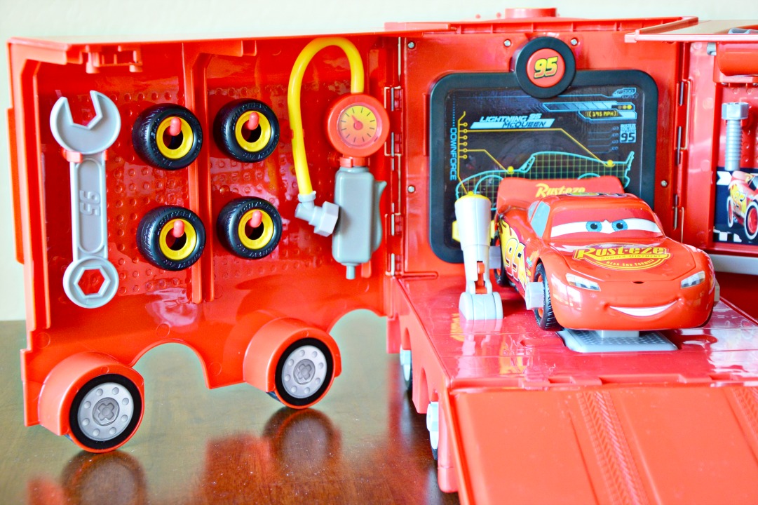 The Just Play Cars 3 Transforming McQueen Tool Kit provides more options to customize Lightning McQueen. This play kit also provides you with spoilers, wheel covers, and exhaust pipes. All tools and car pieces also fit the Lightning McQueen in the Mack’s Mobile Tool Center Play Set. Having both sets is ideal for families with multiple children like ours.