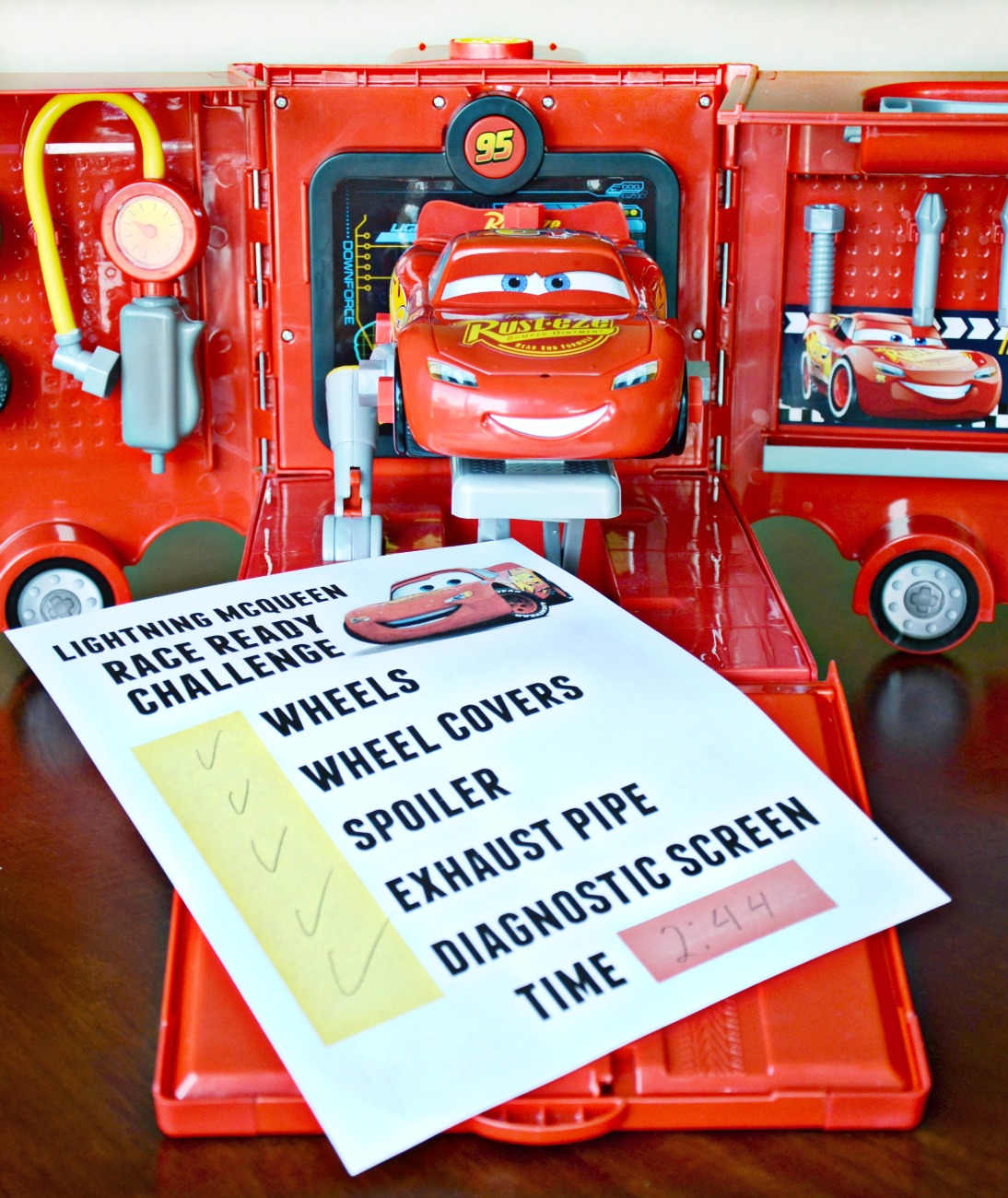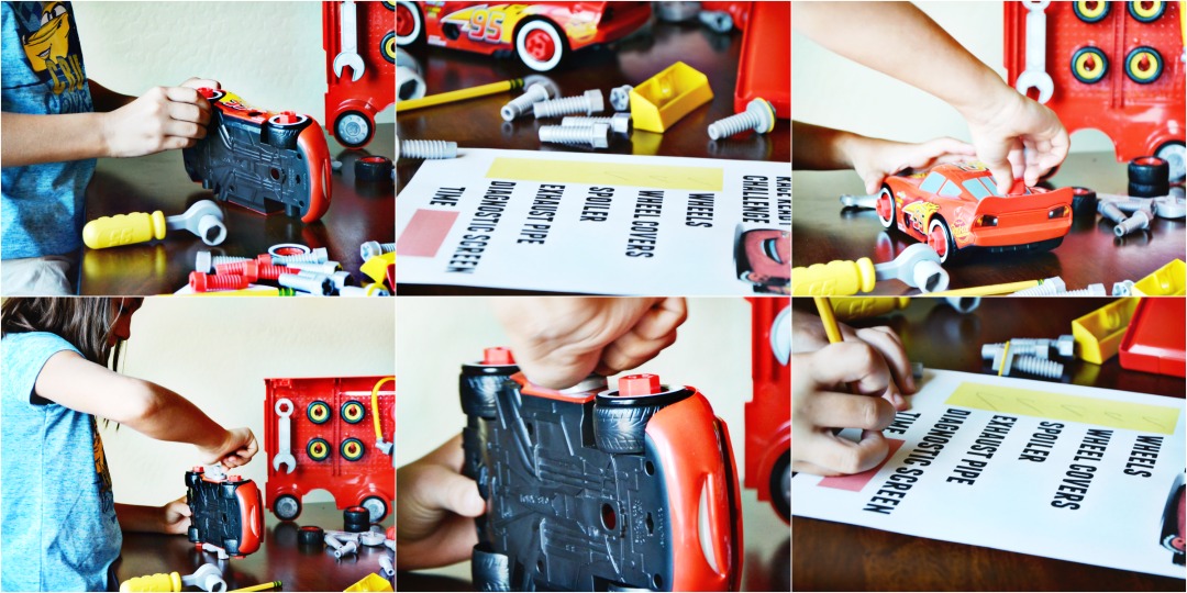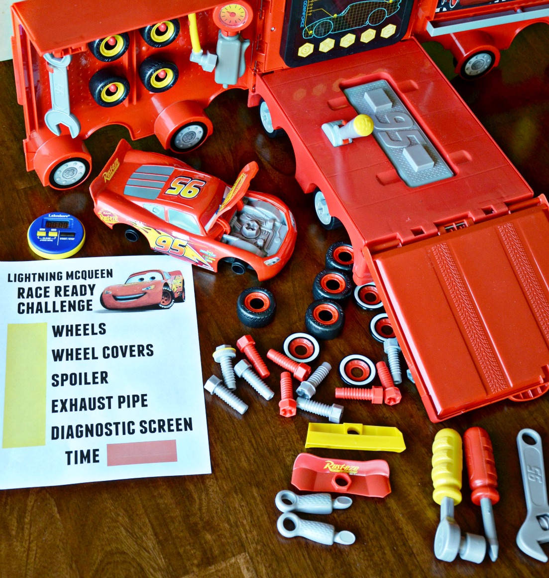 Disassemble Lighting McQueen and place all race ready tools on flat surface for challenge. To complete, you must put Lightning McQueen back together to get him race ready with wheels, wheel covers, a spoiler, exhaust pipe, and run a diagnostic check. Start timer and begin!