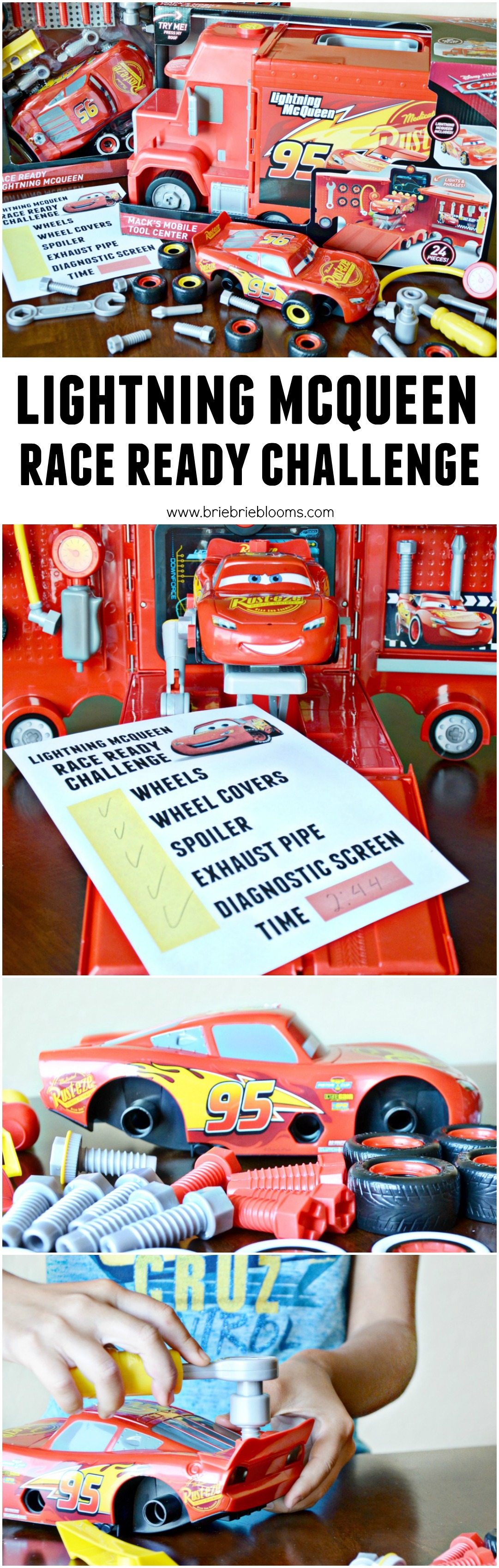 The Cars toys are so much fun to play with and offer endless creativity with so many different race ready options. After playing with the toys for awhile we created a family challenge because our family is competitive and loves family game nights. The Lightning McQueen Race Ready Challenge Activity is a game our family will definitely enjoy playing together all summer long but is great because it can also be enjoyed with just one player too.
