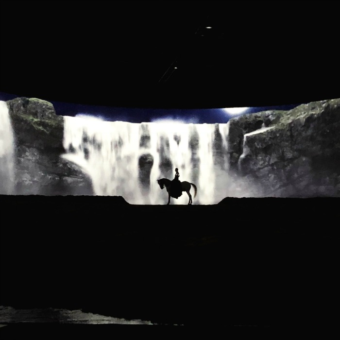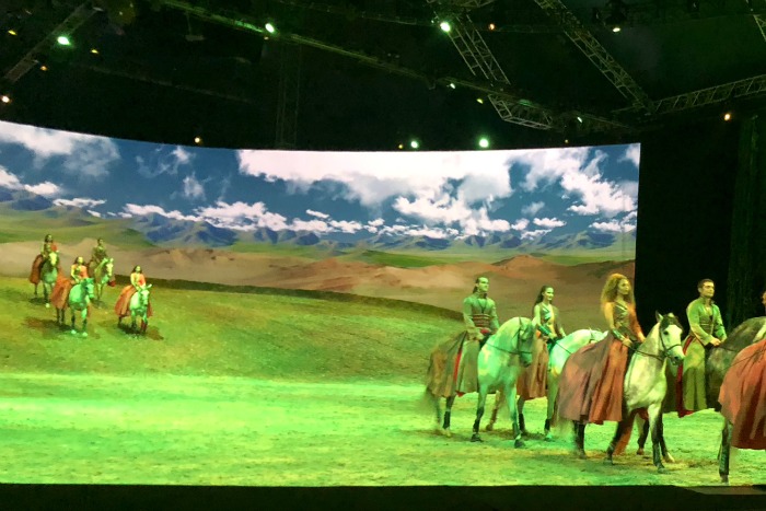 The stage has grown to nearly double its original size providing the opportunity for a 3 story high mountain and incredible visual effects. The changing screen gives life to the background and makes it truly difficult to distinguish between the natural ground and screen. Many times the horses and riders appear to walk right off the screen to their live performance.