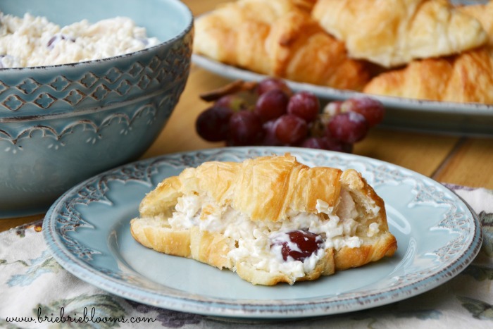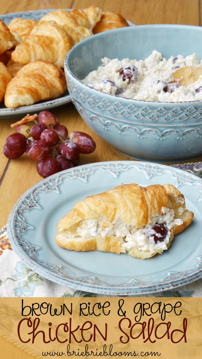 Spread brown rice and grape chicken salad on fresh croissants for a perfect lunch or meal to serve at a potluck.