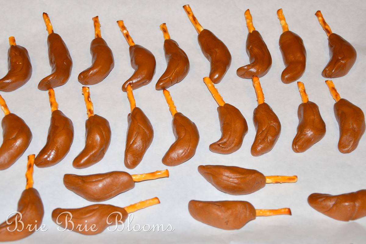 Use two warm tootsie rolls to form a pepper shape around a pretzel stick.