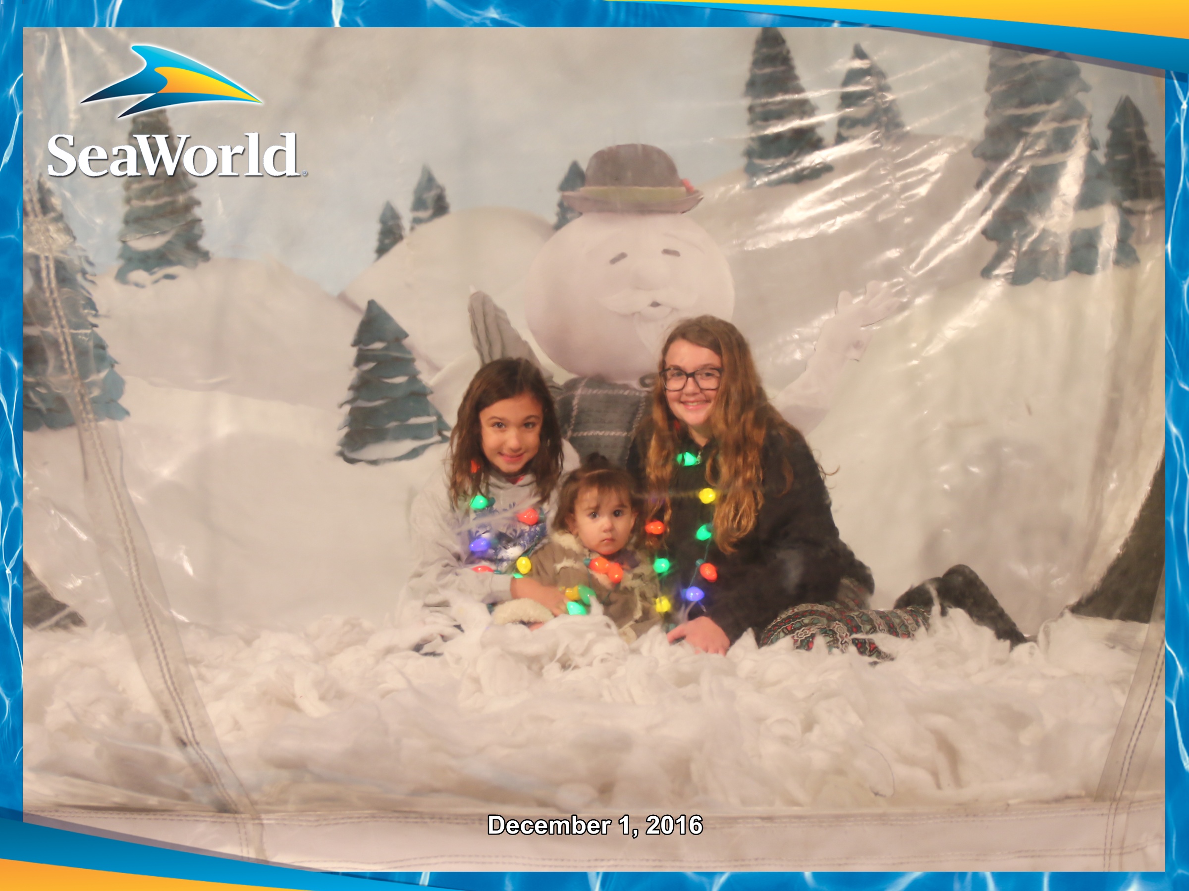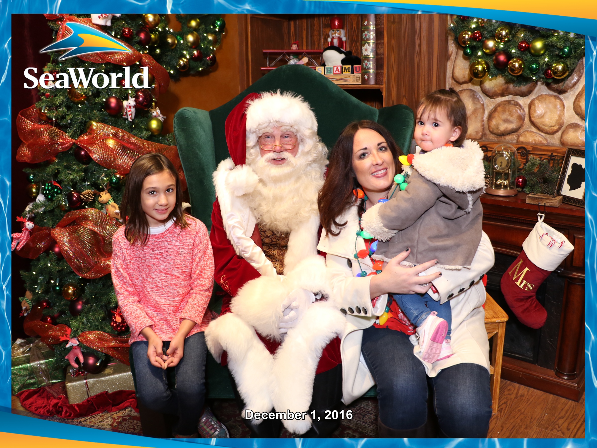 Last year our Santa photo at SeaWorld was an epic baby crying photo. This year baby sister was a little more okay with sitting next to Santa as long as mommy and big sister were there too.