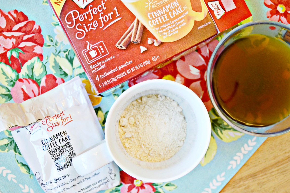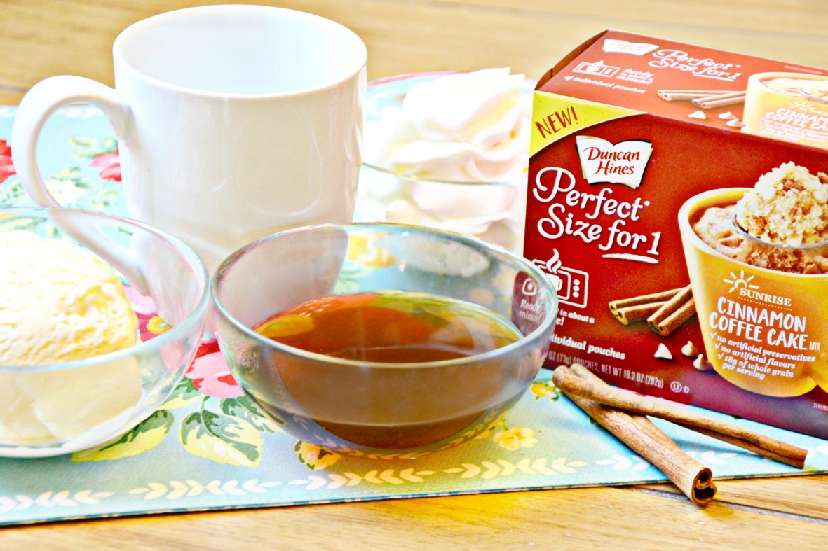 When is the last time you had a perfect treat for yourself with no wait, no mess and no leftovers? Or maybe you’ve never had that experience. Maybe, like me, you’re a mom and spend your days taking care of little people. Little people that need so much of your time and do their best to make sure you never have a treat without them taste testing first because all baking is done in the kitchen making giant messes together. You’re loving every moment together but sometimes you just need a quick treat to yourself. Duncan Hines Perfect Size for 1 is that treat. Cinnamon Coffee Cake is freshly baked in your kitchen without having to turn on the oven.
