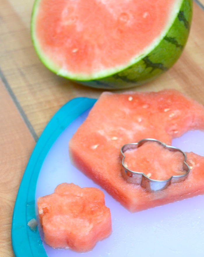 2) Slice watermelon and use metal cookie cutter to cut flower shapes.