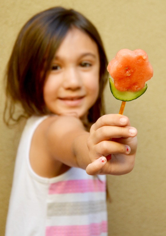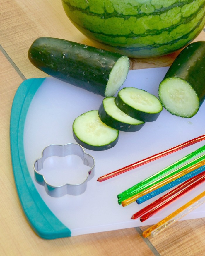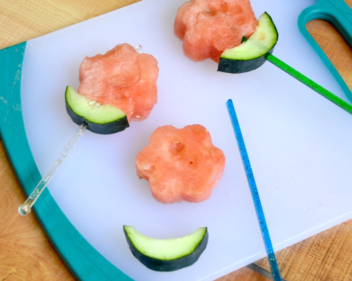 3) Slide cucumber piece and watermelon flower onto cocktail stir sticks.