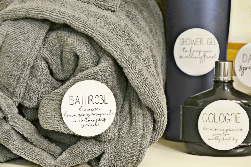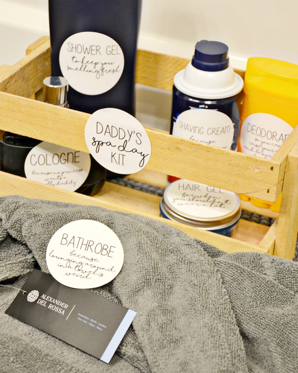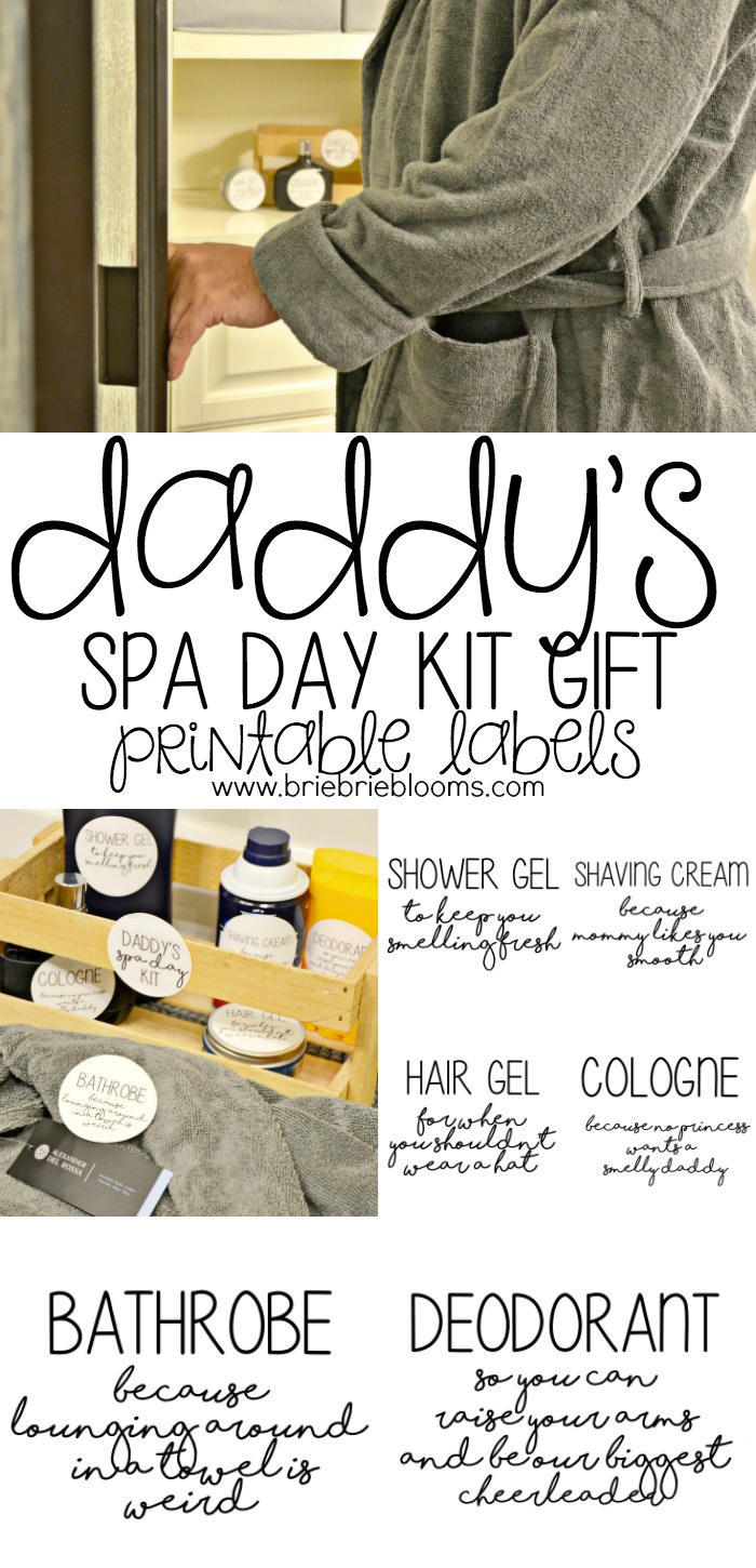 Our house is full of arts and crafts, glitter, nail polish and makeup. My two daughters are very different but always agree on anything sparkly. They also both love a good spa day at home and have fun playing salon. Most days that means their daddy gets to play along and because he’s such a good sport, he usually walks away with a full makeover. This holiday season we are giving him a daddy’s spa day kit gift full of products he will truly love like a new Alexander Del Rossa bathrobe. The men’s turkish terry cloth robe is the perfect beginning to a daddy’s spa day kit. We added some funny printable labels with products he uses everyday so he is reminded of all the silliness in our home each morning before work.