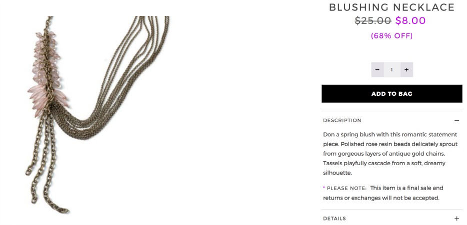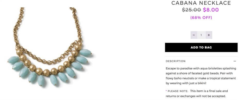 With an additional 70% off the cabana and blushing necklaces are only $2.40. Because these necklaces were both originally priced at almost $100, they are high quality and definitely not reflective of the new less than $3 price.