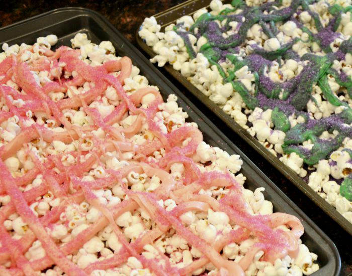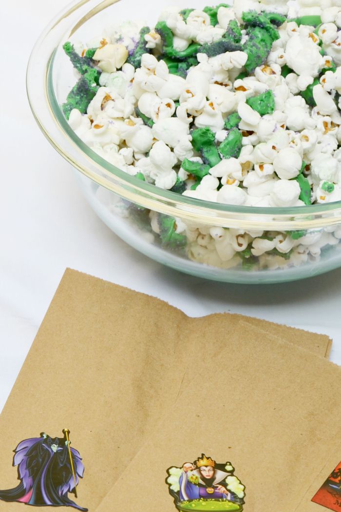 For the Team Villains popcorn: melt green chocolate in microwaveable bowl at 30 second increments, stirring in between, until fully melted. Pour over popcorn. Top with purple sprinkles.