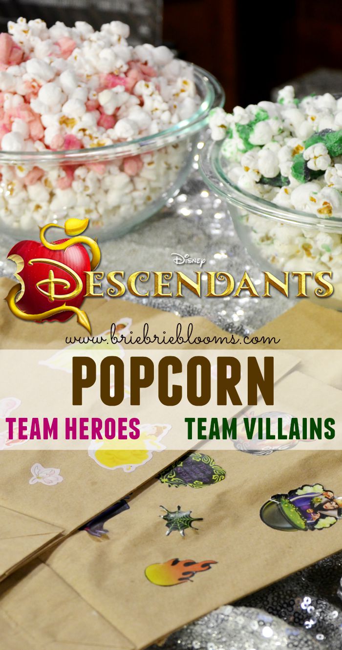 Last week we purchased the new Disney Descendants DVD and have already watched it a few times. The treats we prepared for our Descendants party have made second and third appearances for our many movie nights already. Descendants popcorn has been a favorite in our house and my daughter can’t quite decide if she prefers the Team Heroes or Team Villains treat. The decorated popcorn bags make this the perfect activity and movie snack for nights of Descendants fun.