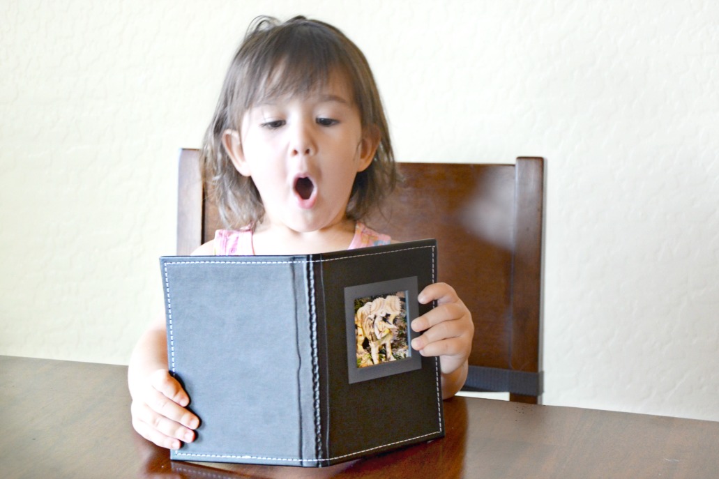 Print larger photos and frame. Place on a shelf next to your child’s favorite corresponding toy. For little sister it’s her dinosaur collection!