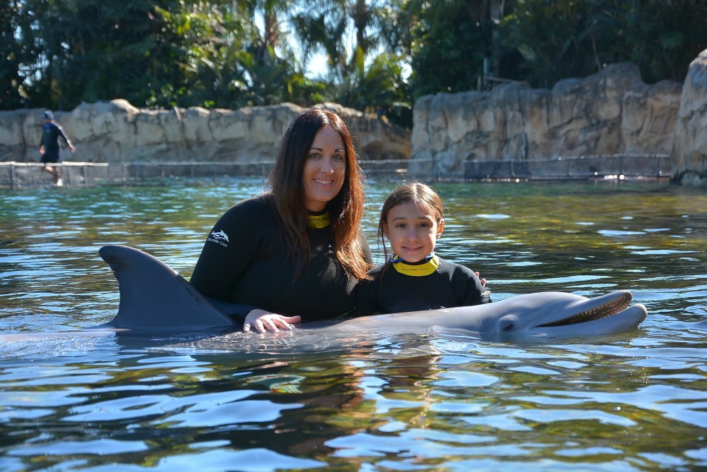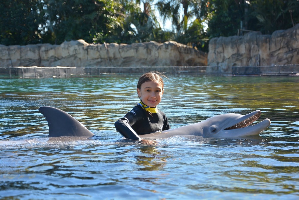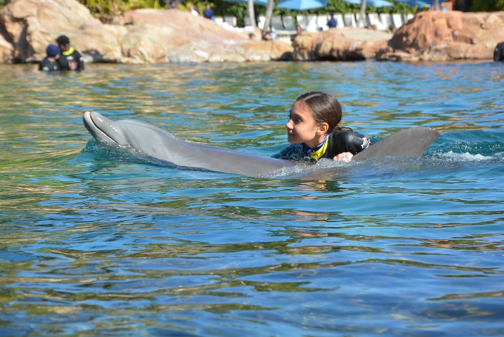 The dolphin swim experience begins with an educational video and then your group is escorted to Dolphin Lagoon to get in the water. Photographers are present and personal cameras or recording devices are not permitted for the dolphins’ safety. The interaction is very educational with many opportunities to ask questions throughout the trainer’s presentation. We learned about our dolphin’s distinct personality while watching behaviors that help us understand their behaviors in their natural environment. My daughter enjoyed every second of the 30 minute interaction. Each participant was given the opportunity to swim alongside the dolphin at the end of the interaction making it a real dream come true for many guests.
