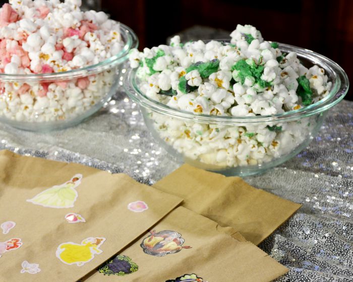 Every movie party needs popcorn! But this isn’t just any popcorn. With so many characters, I couldn’t quite decide if I was team Villains or team heroes. Your party guests will make that decision with their Descendants popcorn choice and by decorating a snack bag with character stickers. Team heroes popcorn features pink chocolate and hot pink sprinkles while the team Villains popcorn has green chocolate and purple sprinkles.