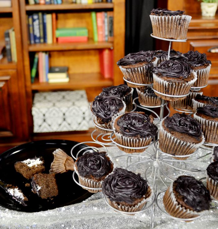 I’m most excited about the “which villain are you?” cupcakes! I ordered dark chocolate cupcakes unfrosted from our local grocery store bakery. Then cut out a hole in the center and filled them with frosting and sprinkles matched with Villains from the movie – orange frosting with gold sprinkles for Jafar, green frosting for the Evil Queen, and white frosting with white and black sprinkles for Cruella De Vil. Each cupcake is topped the same with black frosting. You don’t know which villain cupcake you get until you take a bite!
