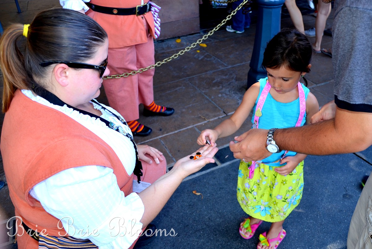 Next she traded with a cast member in front of the Pirates of the Caribbean ride.