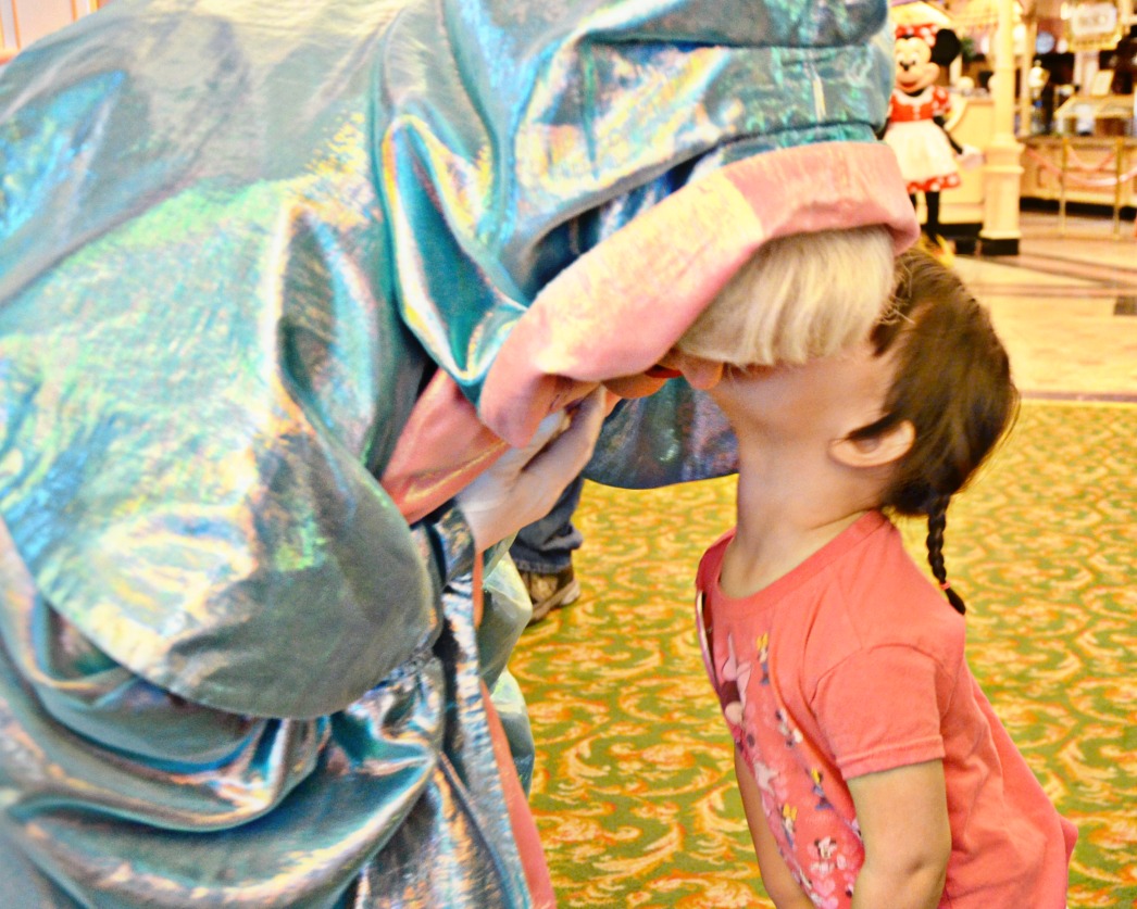 Little sister shared a sweet kiss on the cheek with the Fairy Godmother.