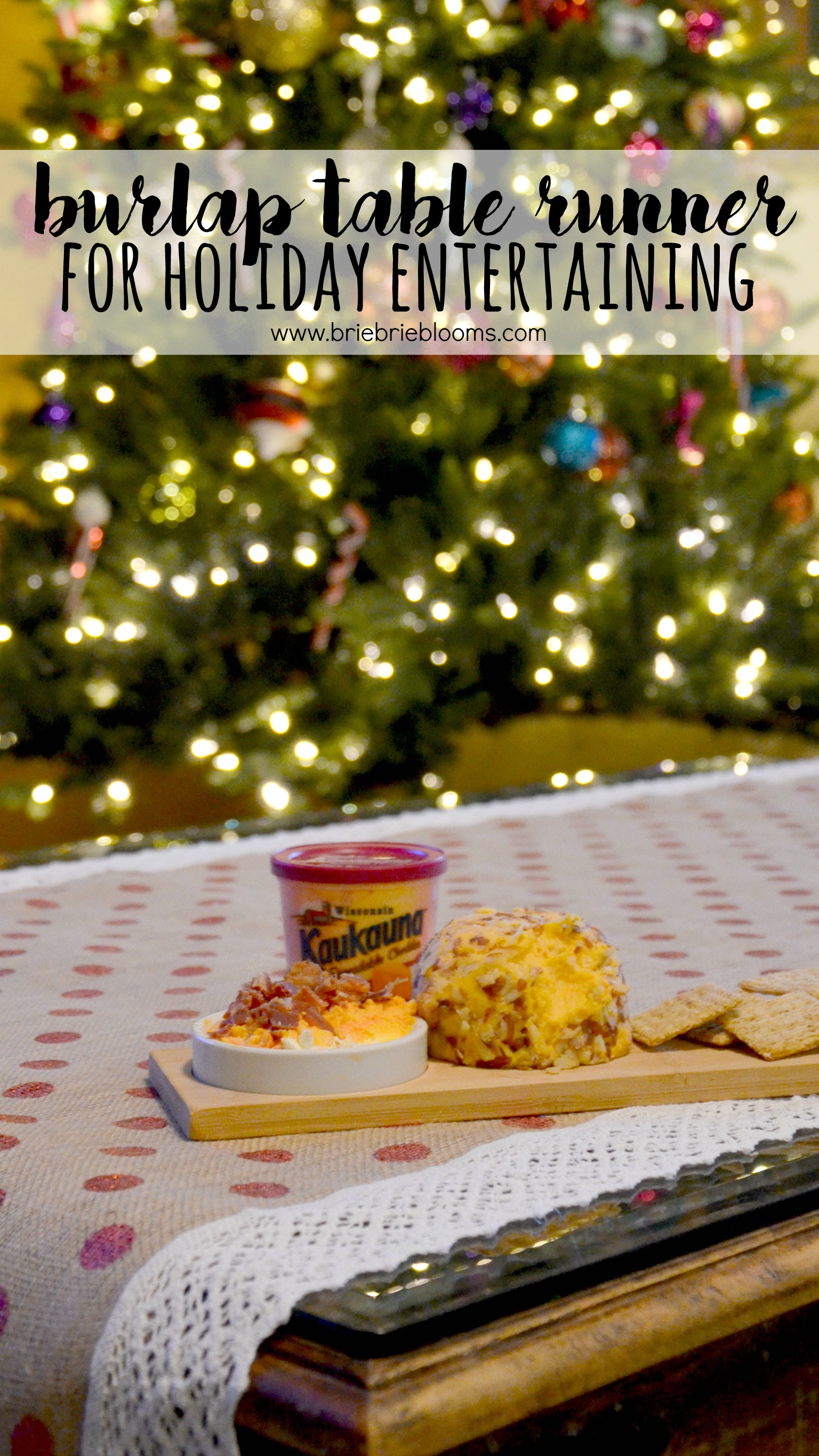 When my doorbell rings unexpectedly during the holiday season it usually is followed by a neighbor delivering cookies or a friend dropping by their family card. Most days that unexpected doorbell ring makes me want to run and hide because I’m not prepared with an easy holiday entertaining plan for our home. This year we are ready! The easy burlap table runner I made and Kaukauna® cheese products from Kroger have me feeling prepared for surprise visitors. A quick port wine cheddar and bacon recipe is perfect for entertaining all year long and can be made with just three ingredients.