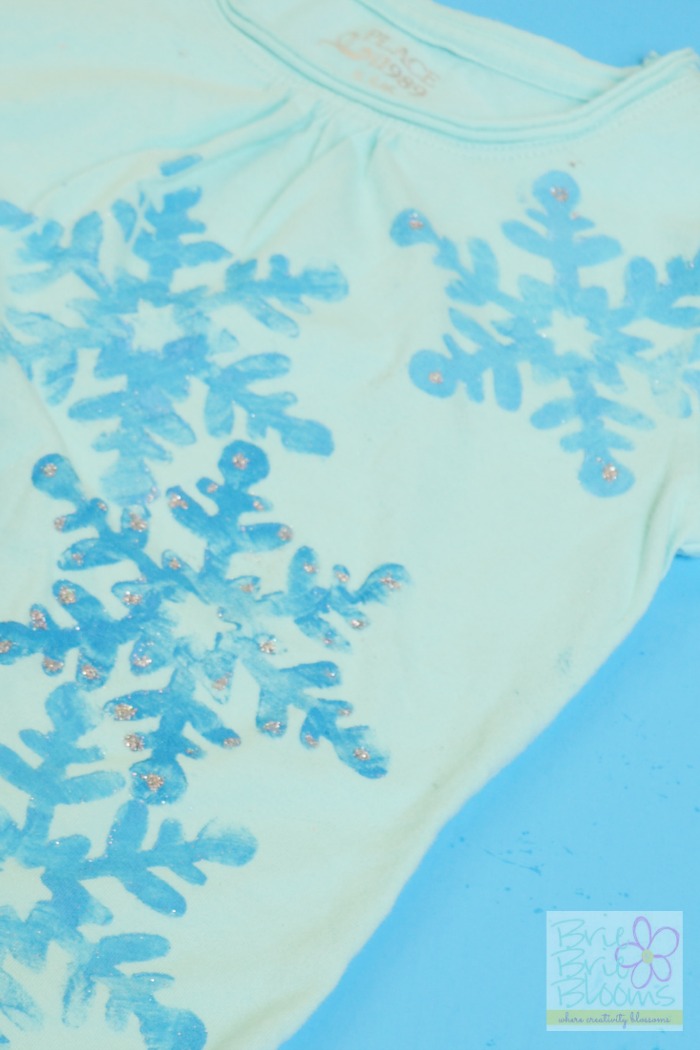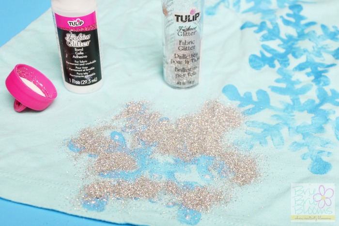 For sparkly snowflakes, use fabric glue and glitter to decorate your DIY FROZEN shirt. My daughter carefully painted dots of glue on her snowflakes and then sprinkled the glitter directly on top.