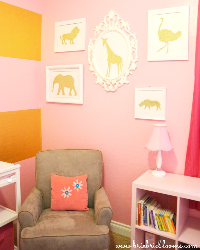 Hang the DIY glitter animal wall art in a collage or individually as you desire. The art looks great in our pink and gold nursery but would also be fun in an older child’s room or bathroom.