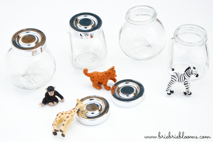 Paint animals and jar lids with gold spray paint. Allow to dry completely.