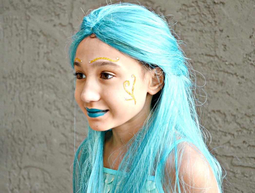 My daughter wore a turquoise glittered wig and matching lipstick. We also used Roman Queen makeup decals on her face but instead of placing the eye decals directly under her eyes like the packing suggested, we turned them down the side of her face to look like coral.