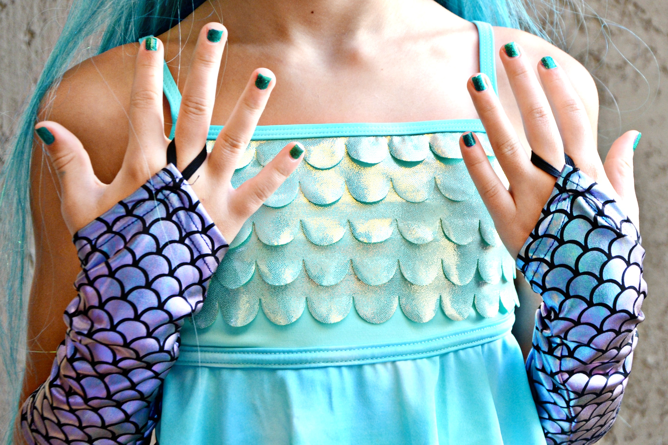 We paired the leggings and gloves with a scalloped swimsuit top for the perfect DIY mermaid costume. This morning my daughter wore her costume to school and felt great knowing she wouldn’t match any other friends because we had mismatched pieces to put together the pretty look.