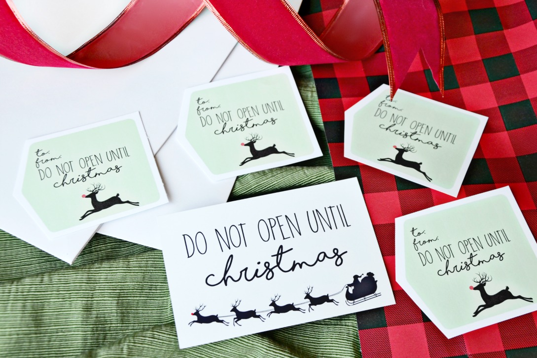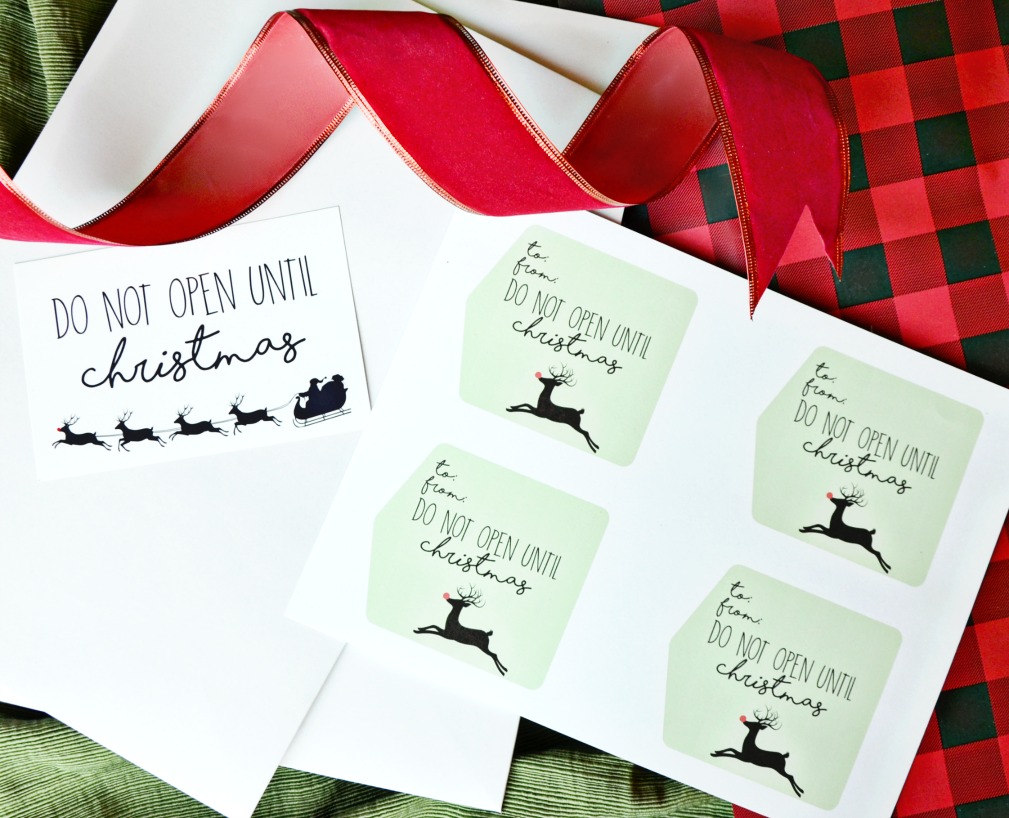 Both printables are easy to print from your home printer. Print the Do not open until Christmas gift tag printable on letter size cardstock then cut out each tag. Print the Do not open until Christmas package label printable on 4″x6″ photo paper.
