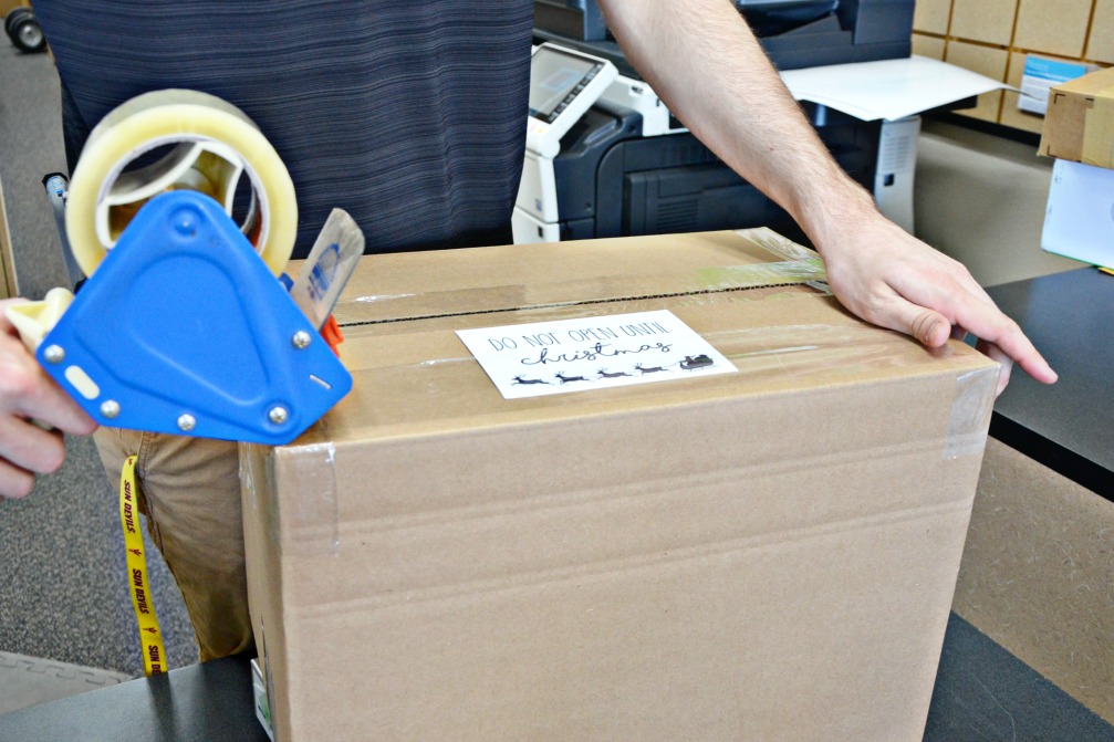 We brought our gifts home and printed the Do Not Open Until Christmas Holiday Package Wrapping printables. We wrapped our gifts and headed to The UPS Store for help getting the presents into an appropriate box to send to my brother and his family.