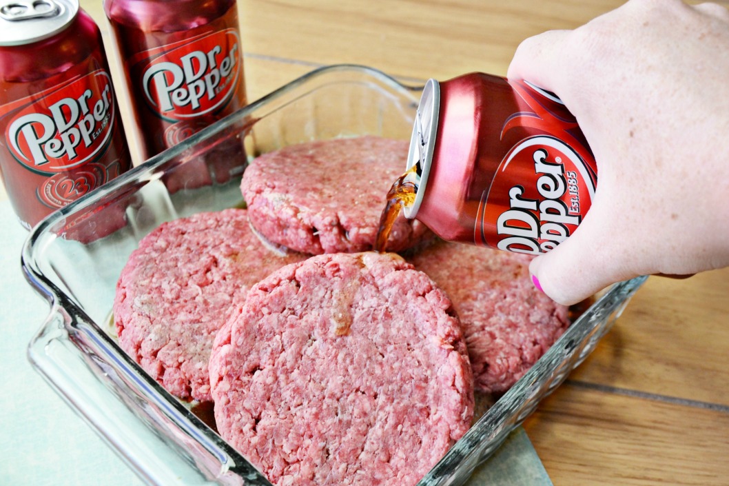 Prepare burgers by marinating overnight in Dr Pepper. Shape hamburger patties and place in glass casserole dish. Then fully cover raw patties in Dr Pepper.