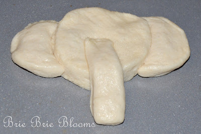 Each elephant used two pieces of dough from the canned biscuits. The first was used for the head shape. The second gets cut into thirds to use as the trunk and ears. We sprinkled sugar on the dough before the elephants were assembled.