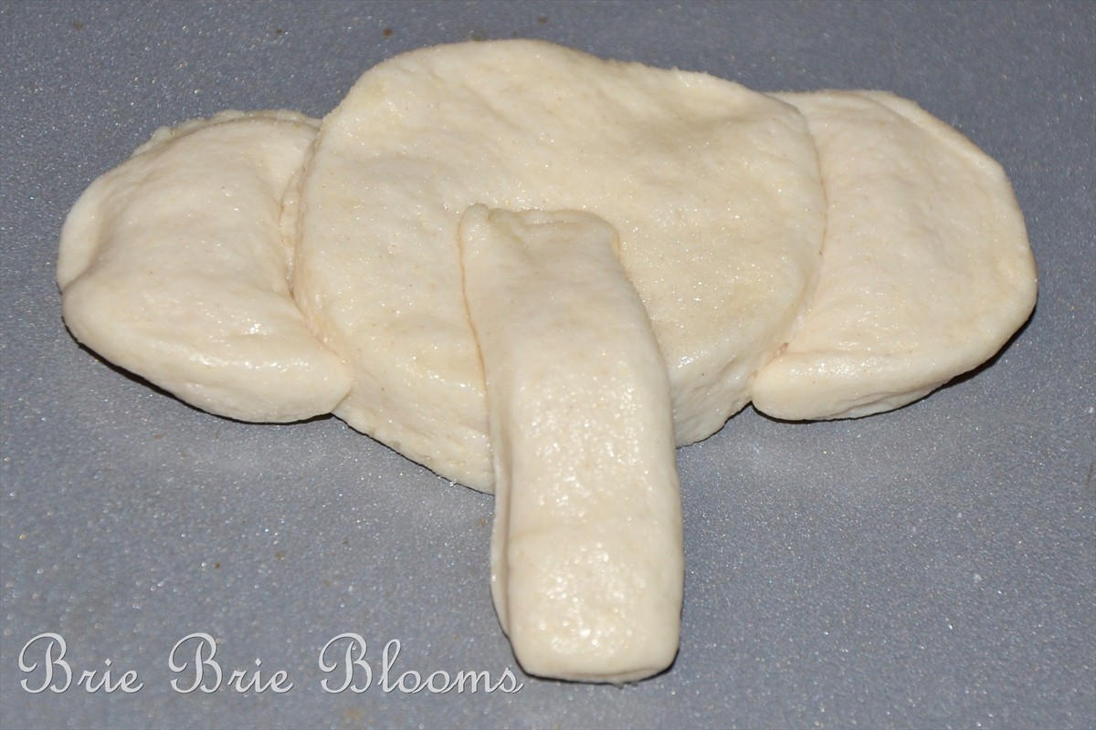 Each elephant used two pieces of dough from the canned biscuits. The first was used for the head shape. The second gets cut into thirds to use as the trunk and ears. We sprinkled sugar on the dough before the elephants were assembled.