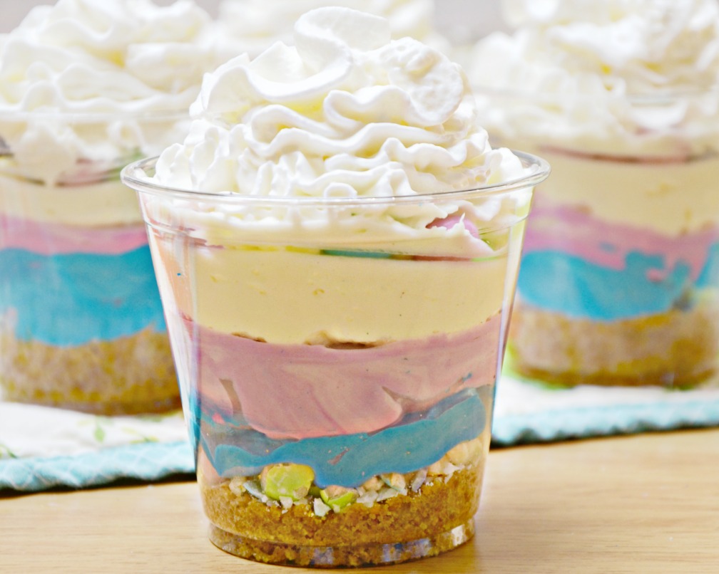 Layer colored cream cheese filling in no bake cheesecake cups. Our cups are blue, purple and white but you can use any pastel colors for the festive Easter dessert.