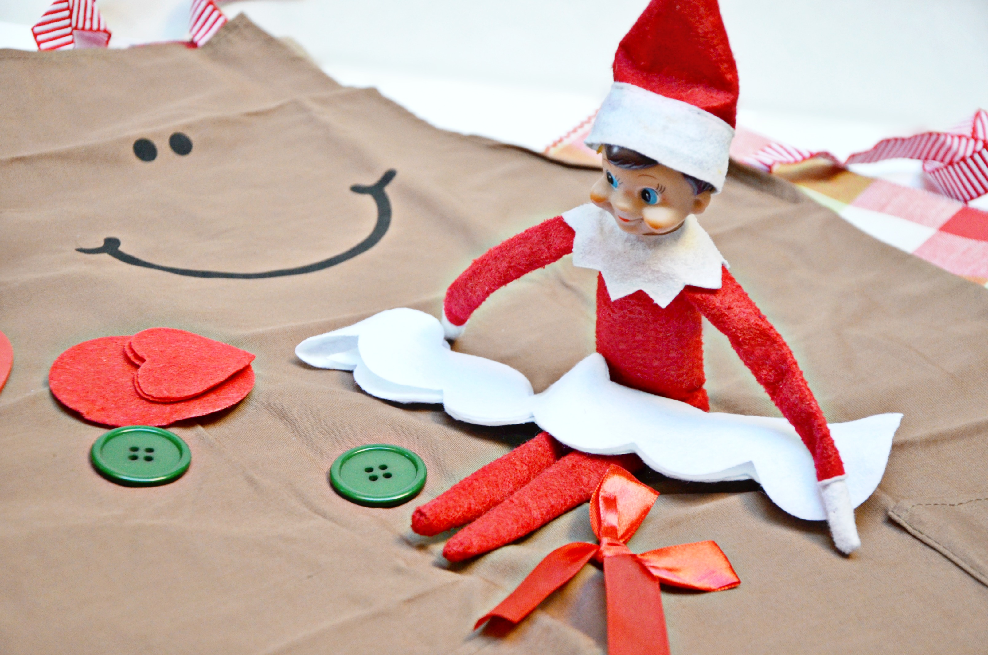 All elves like to bake. Take a look on Pinterest, every Elf on the Shelf makes a mess with snow angels in sprinkles, beautiful decorated cupcakes and even homemade gingerbread houses. But how many elves actually deliver an apron with craft supplies for personalization? The Gingerbread Child’s Apron Kit is a great holiday craft and super special baking surprise from the Elf!