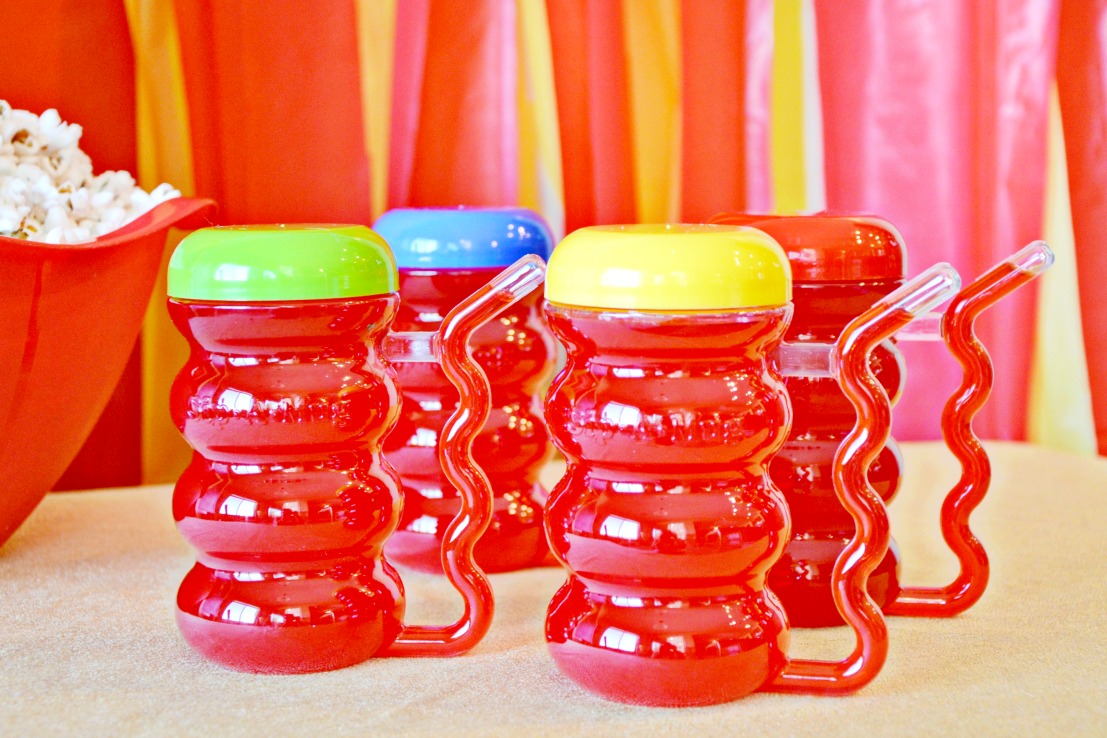 Silly straws are fun but cups with straw handles are even better. I made punch for the cups and placed them on our snack station table so everyone could pick their favorite colored lid.