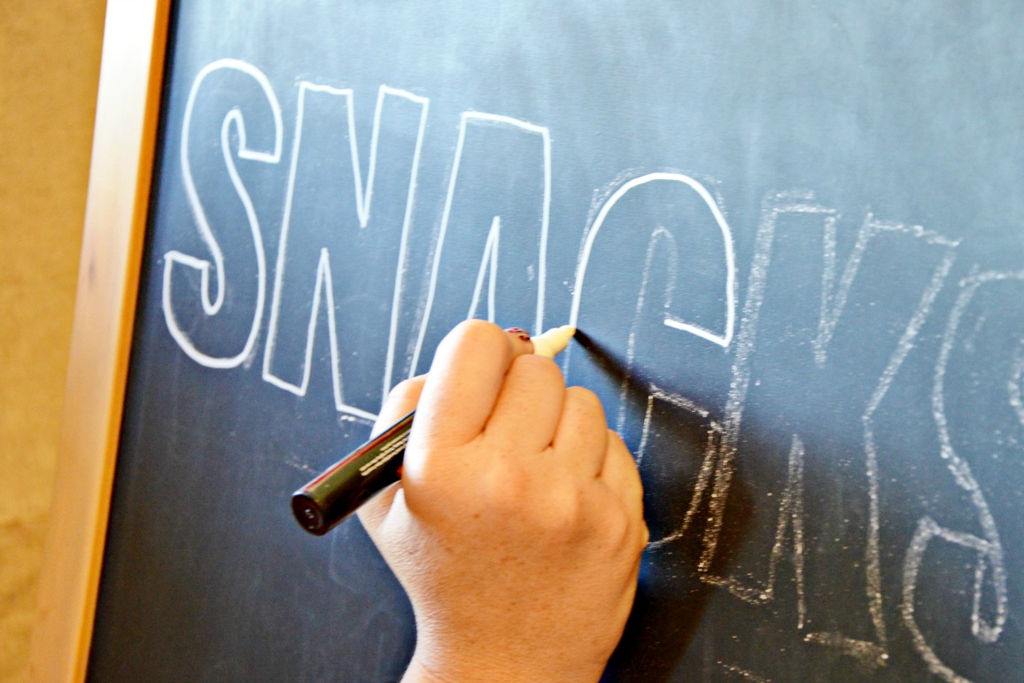 For our family the movie theater experience is all about the snacks so I made a quick concession stand with a chalkboard easel. I printed “SNACKS” then transferred it to the chalkboard by tracing the back of the paper with white chalk. Then I traced the letters with a chalk marker.