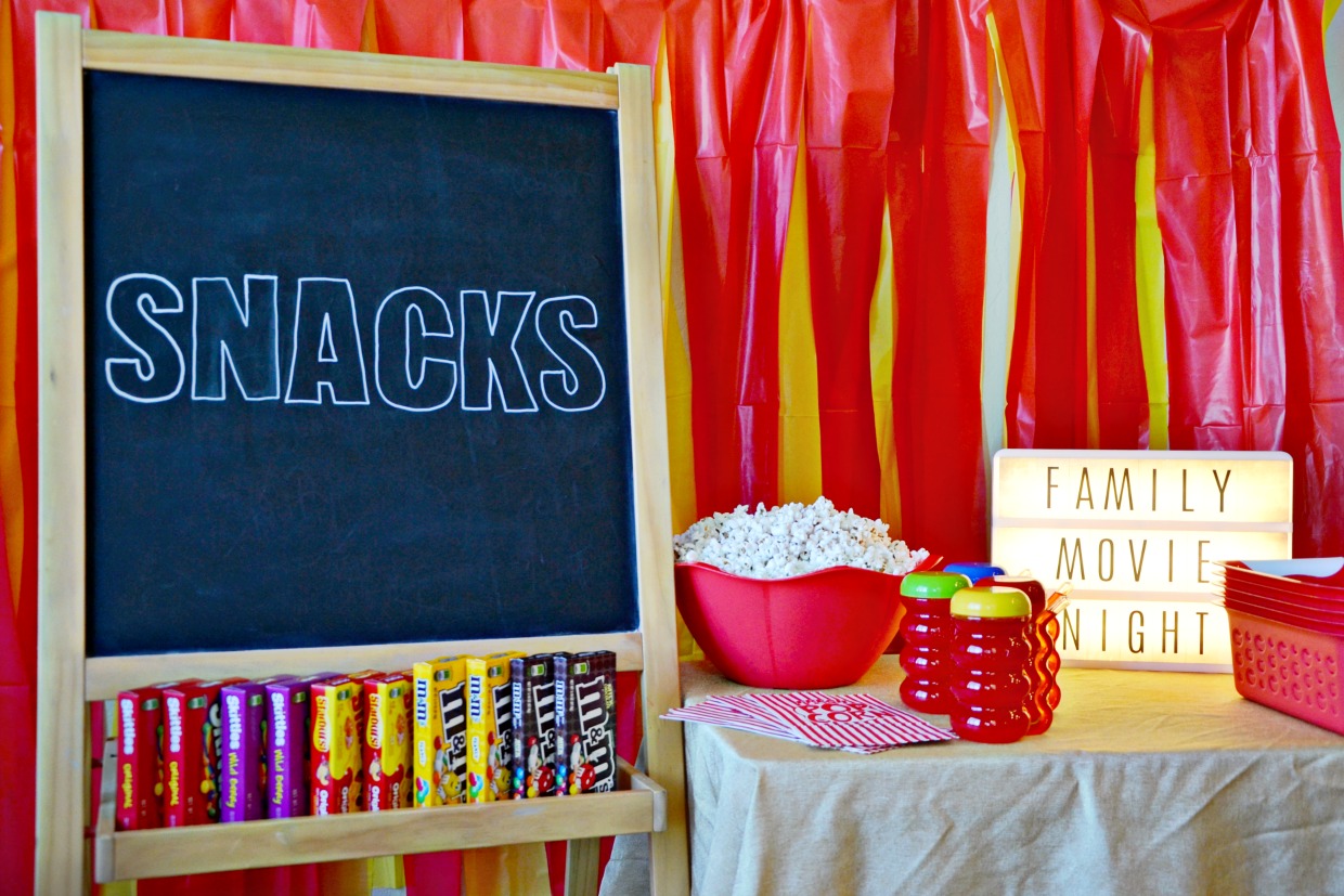 A lit marquee and snack station full of treats, popcorn and silly drink cups gave our family movie night a real theater feel. I made a backdrop with red and yellow vinyl tablecloths like the one I made for our first birthday mermaid party. The table also featured popcorn bags and bins so everyone could easily carry their snacks to a favorite living room seat.