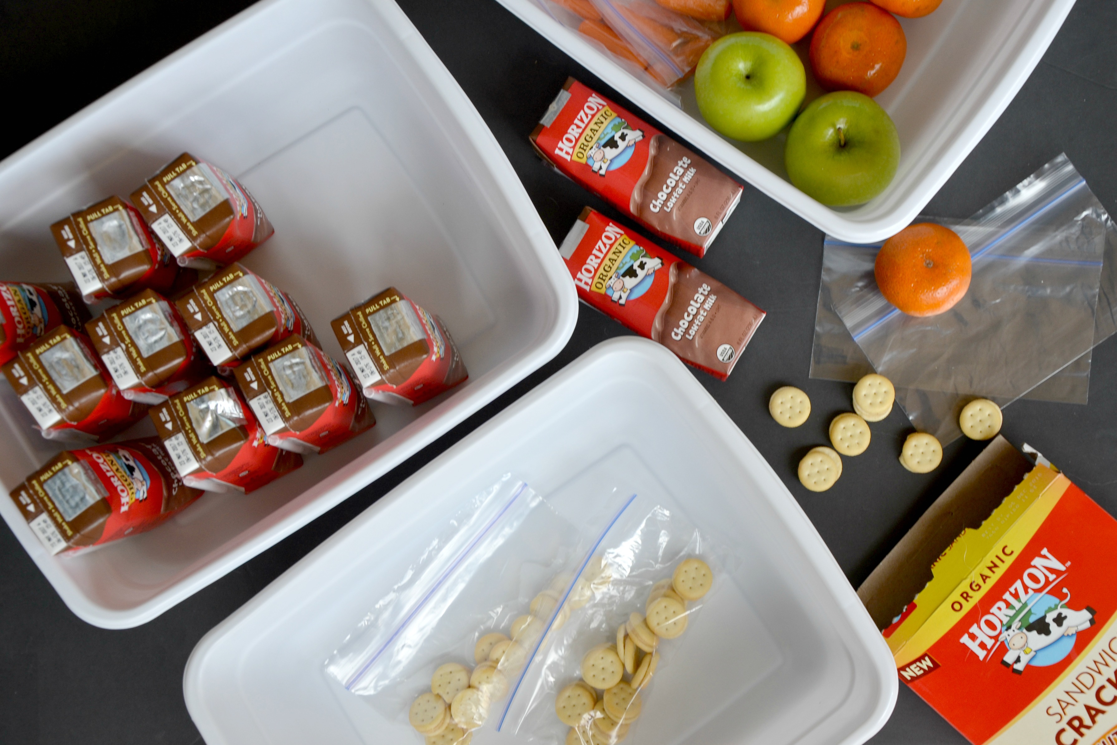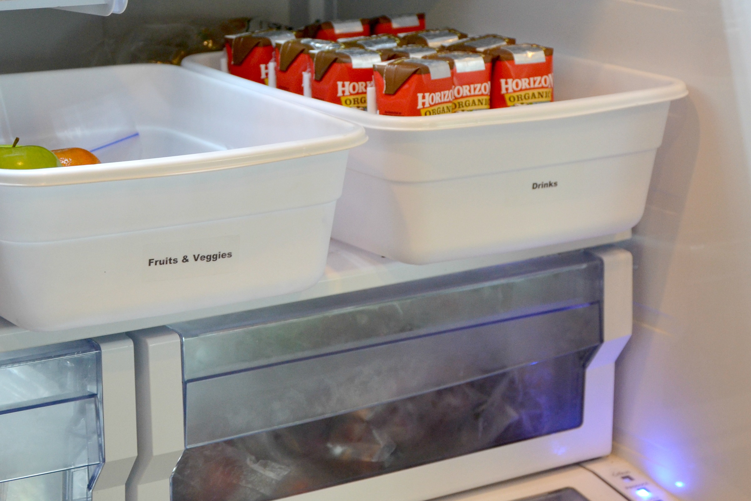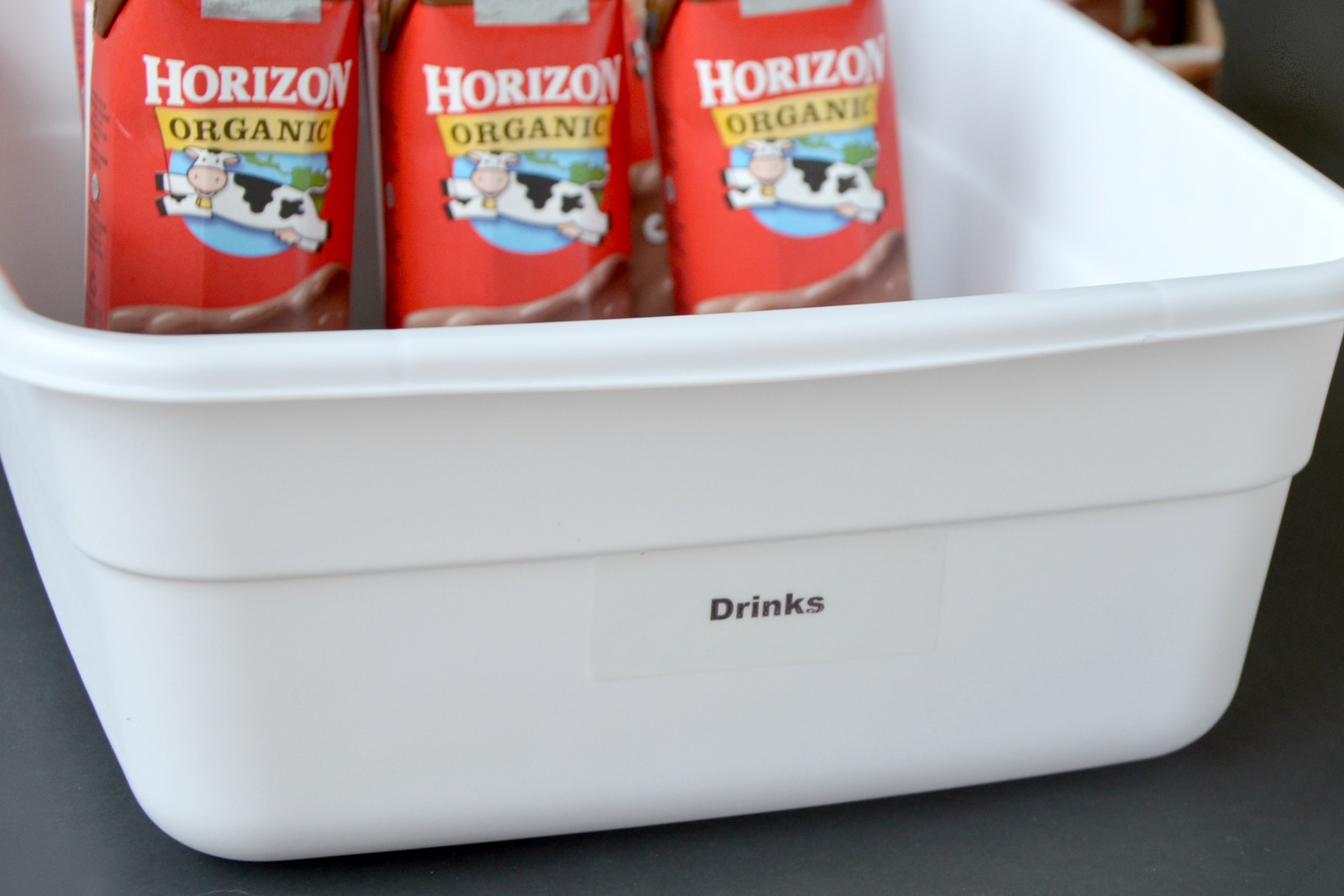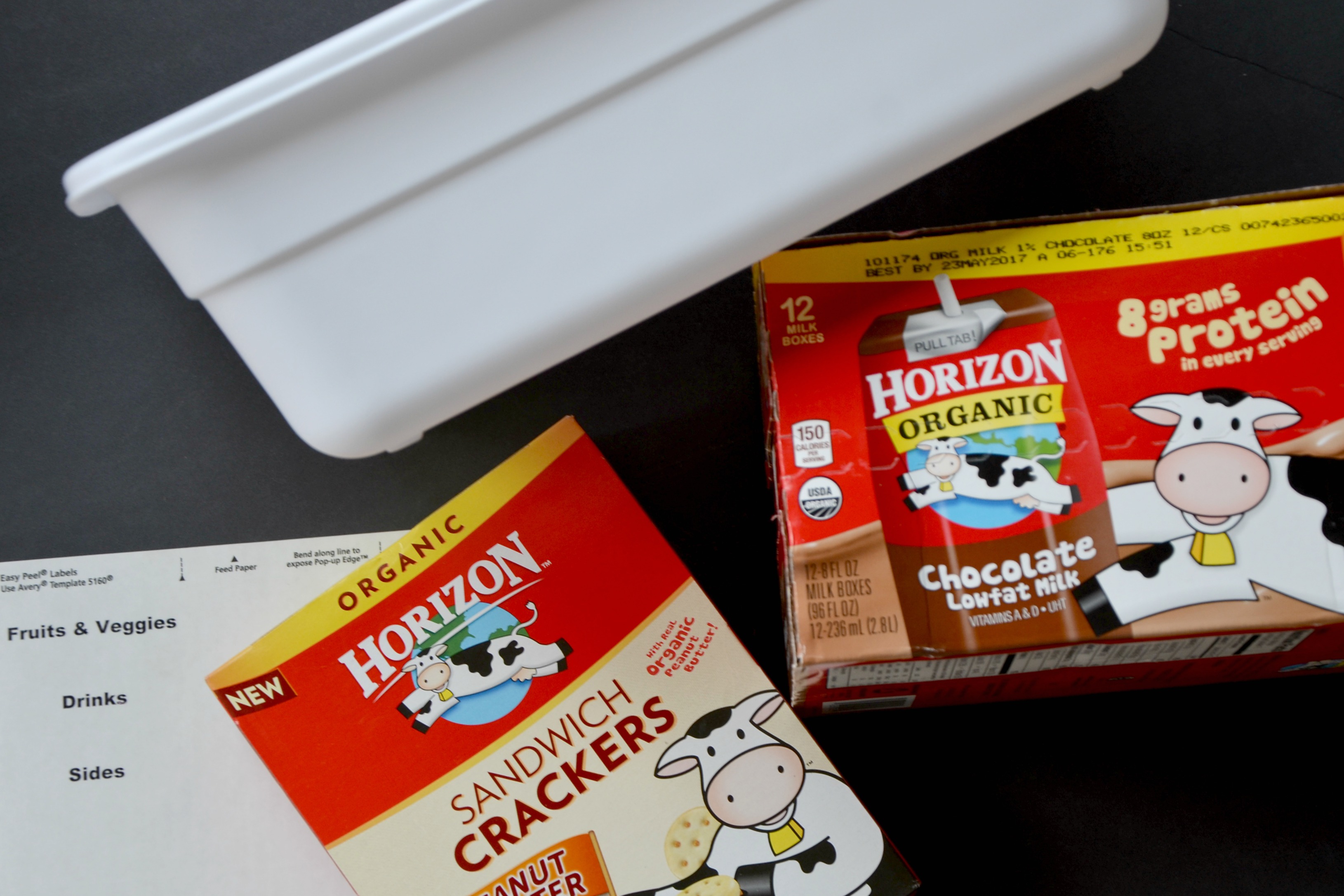 Print labels from your home computer on clear address labels to begin the lunch box organization. Place labels on bins then fill with your favorite Horizon Snacks! Horizon Single Serve Milk Boxes have 8 grams of protein and the chocolate milk is flavored with organic cocoa.