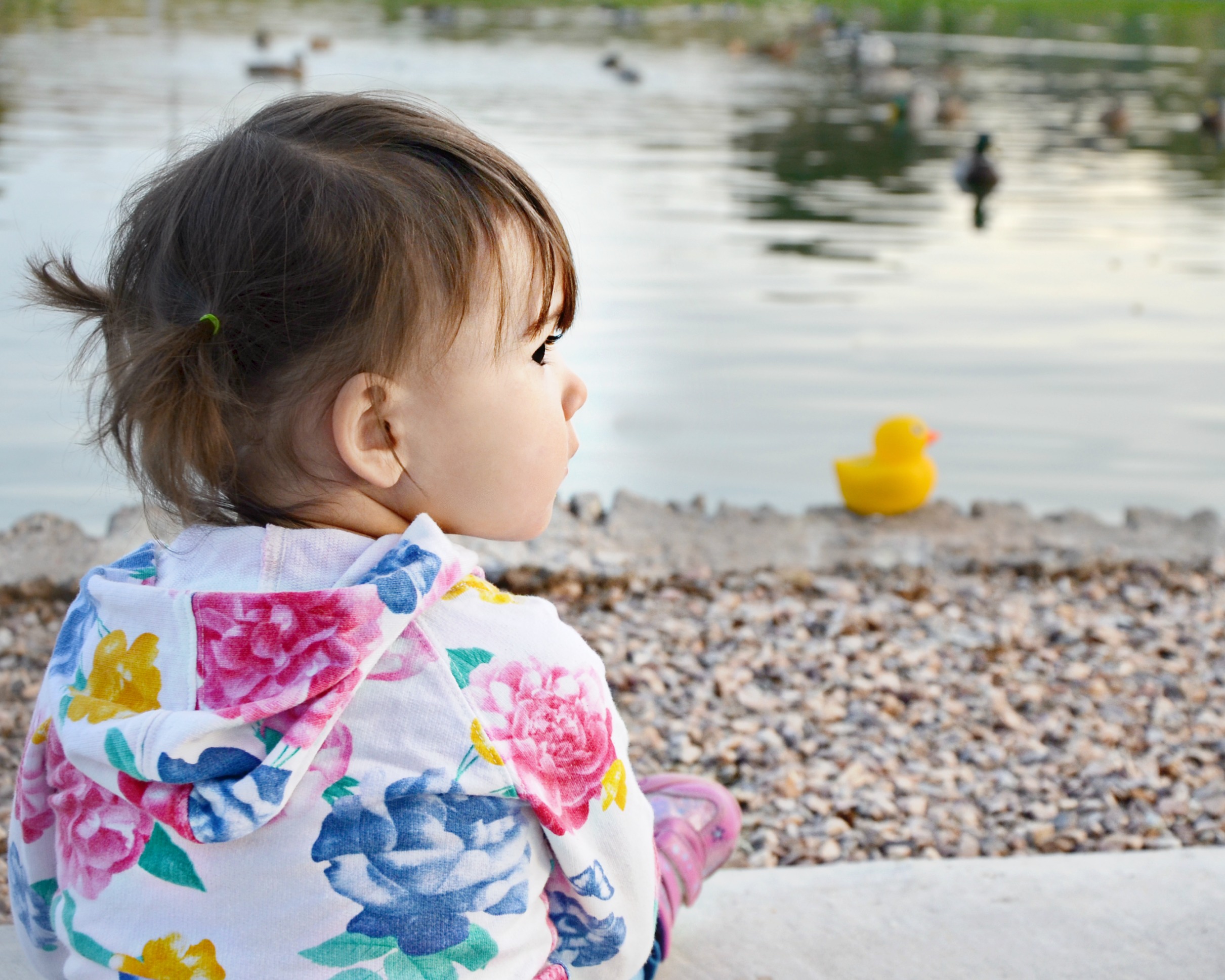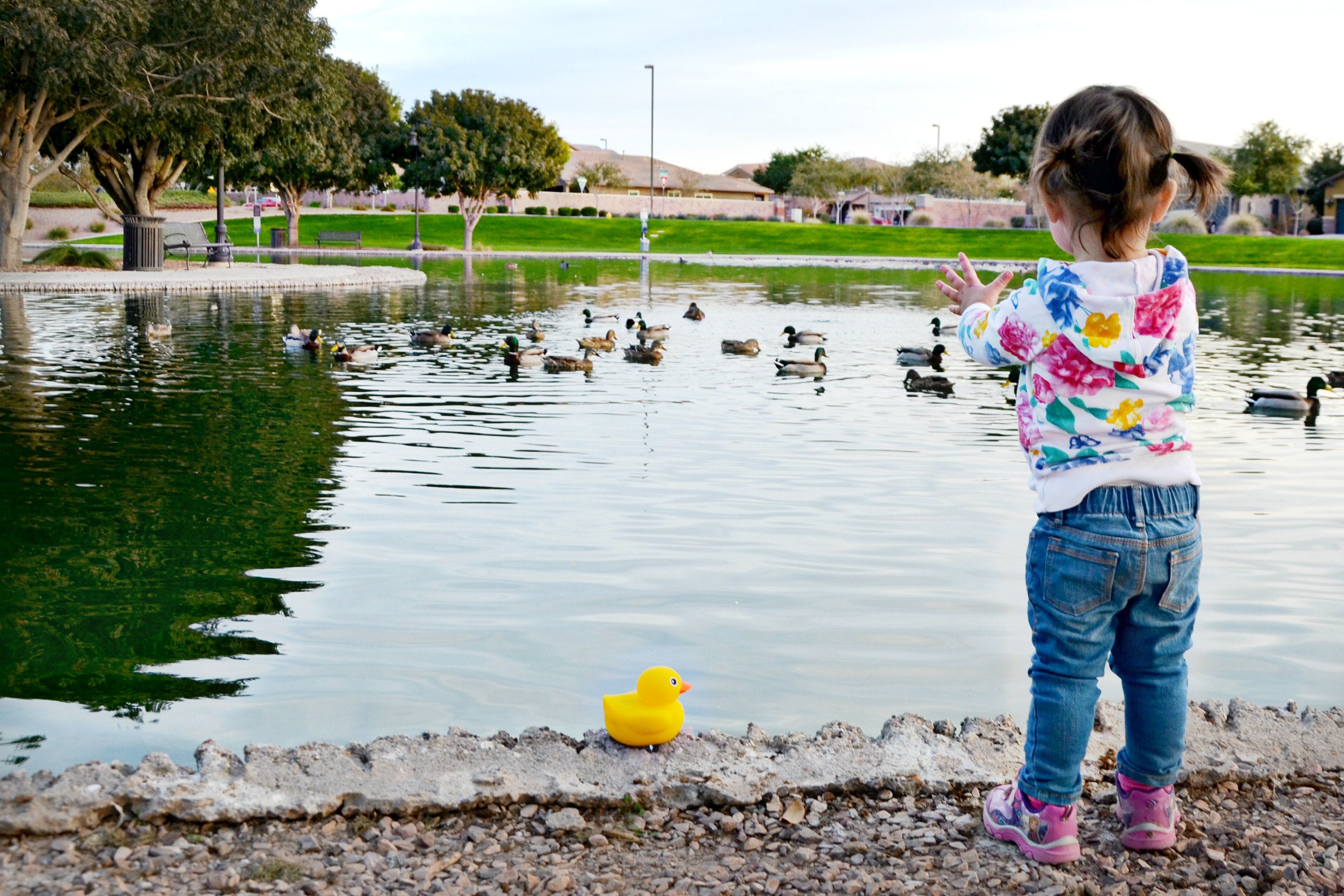 After some time with her iPad, she decided we should go for a walk and introduce Edwin the Duck to the real ducks at our neighborhood lake.