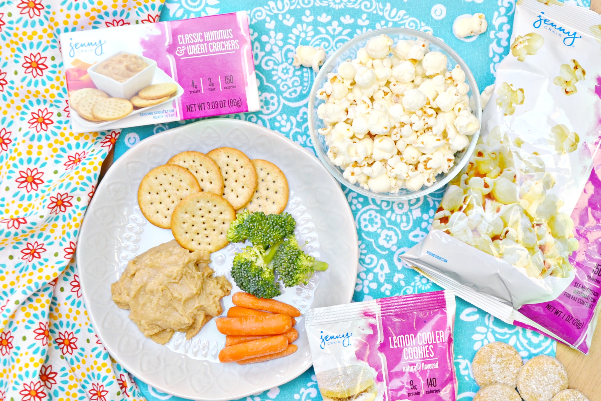 Jenny Craig Iced Oatmeal Cookie, Chicken Cranberry Salad Kit, Classic Hummus & Wheat Crackers, S’mores Bar, White Cheddar Popcorn, Anytime Bars Cookie Dough Bar