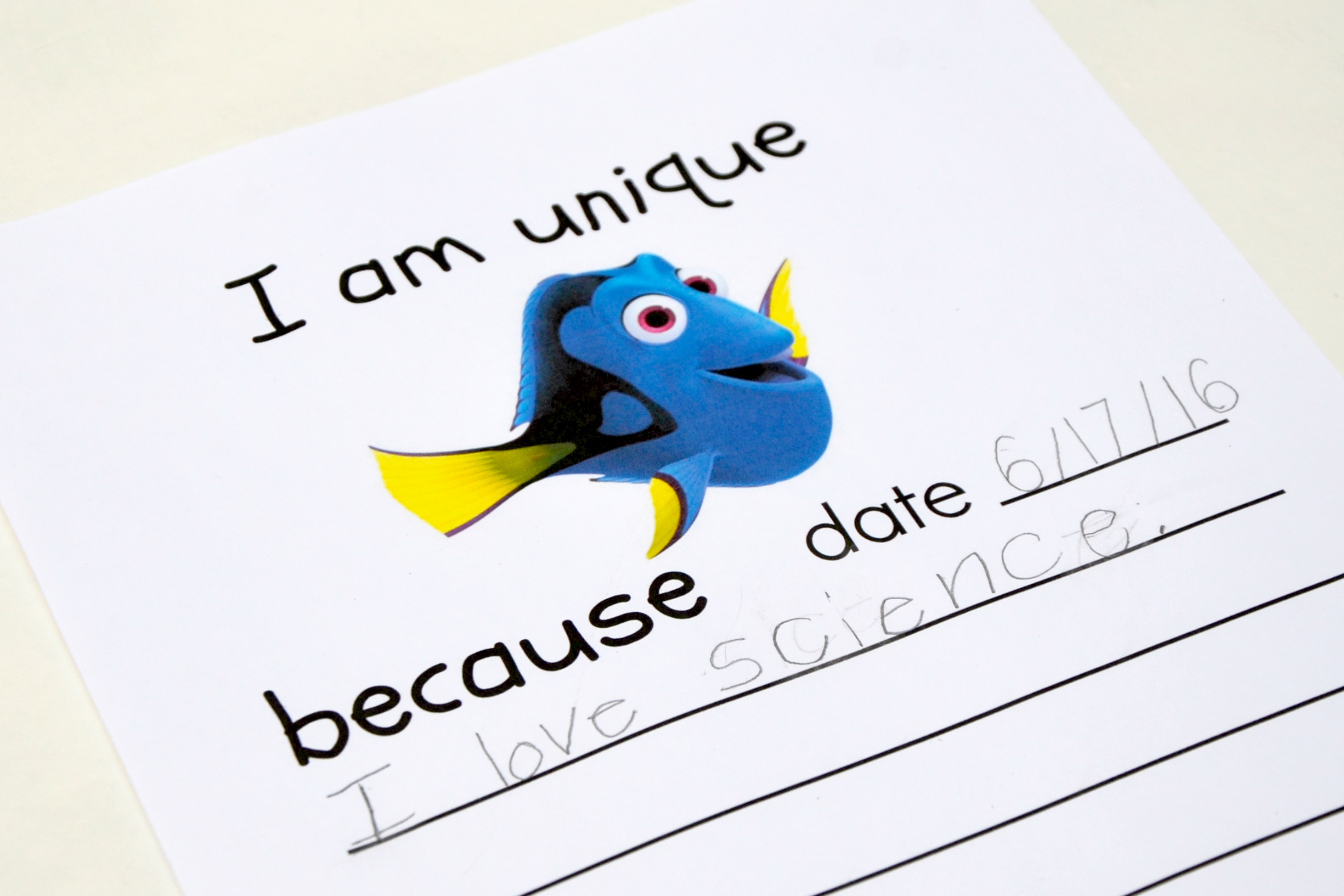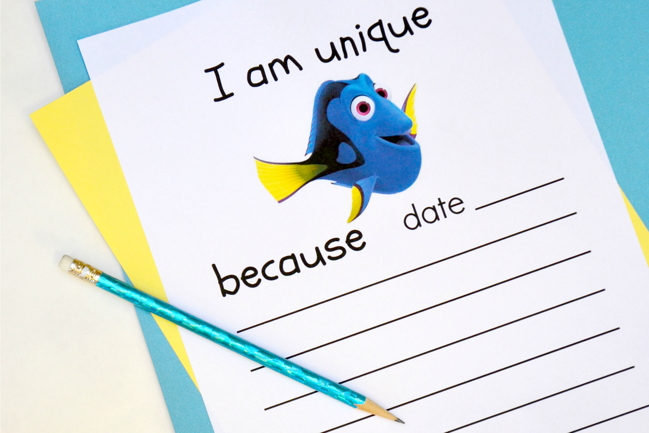 Print the free printable Finding Dory writing prompt activity on your home computer and ask your child to write about the characteristics that make them unique.
