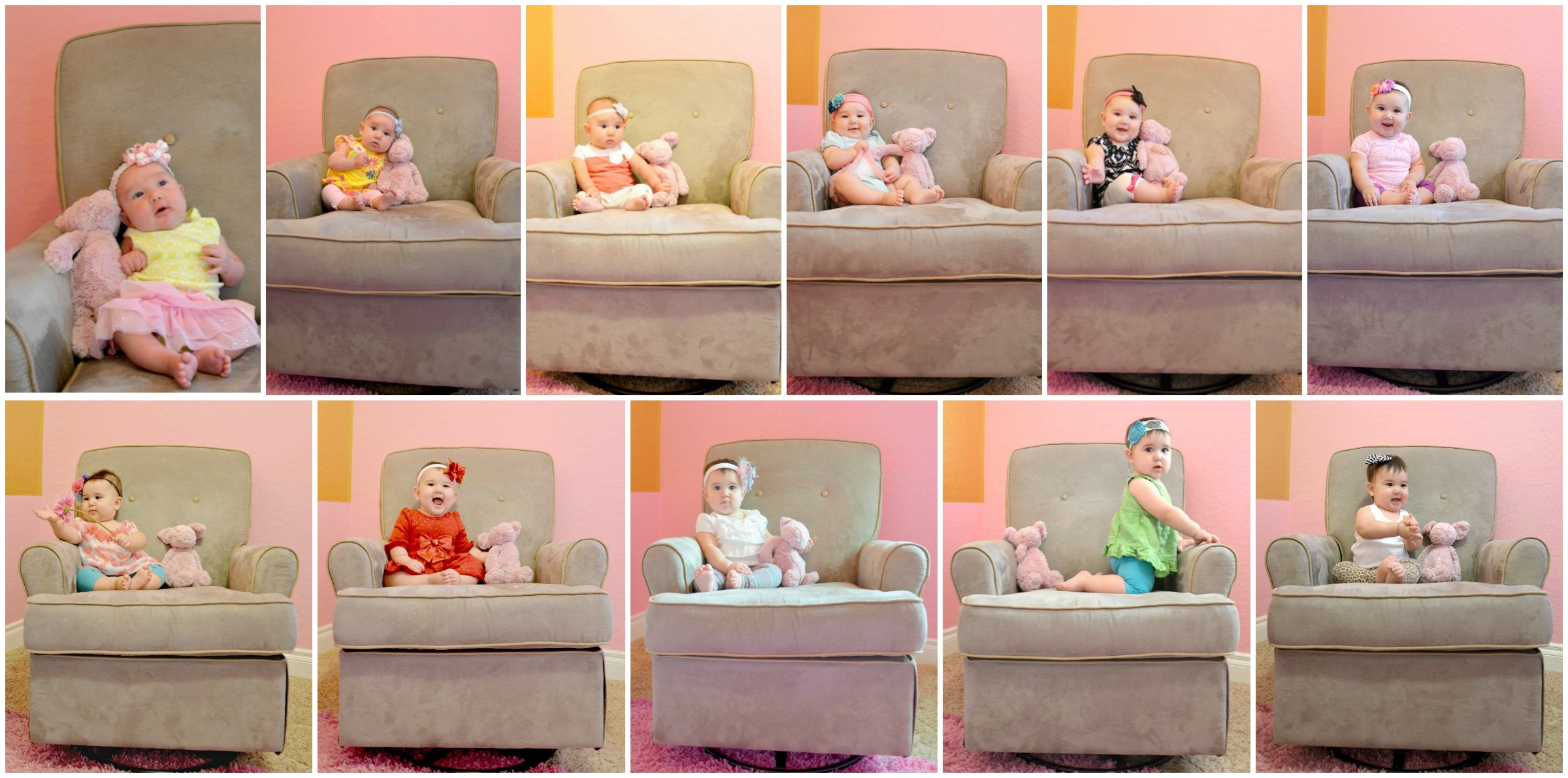 Each month I took the same photo of our baby in her nursery chair with a favorite stuffed pig. The party guests enjoyed being able to see how she grew each month.